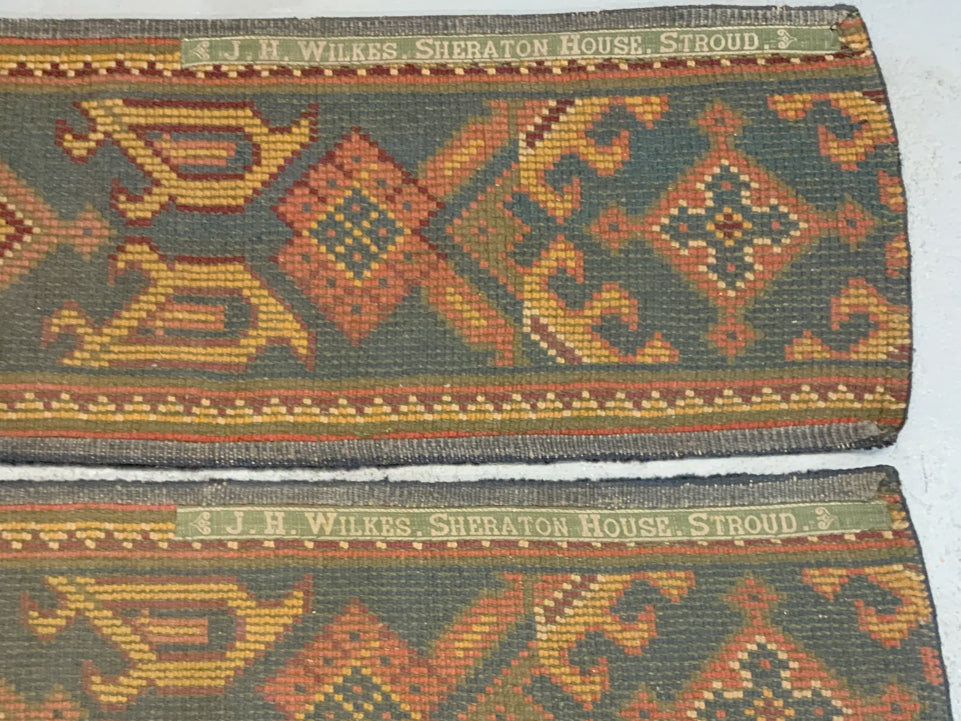 During a visit to the local St. Laurence Church in the Shambles at Stoud Gloucesteshire a pair of runner kneelers were discovered in the Chancel largley forgotten about even to the former Church Warden. The two were made in Co. Donegal just after WWI in what would have been the newley nationalised Killybegs Mill formally owned by the Scottish indiustrialist Alexander Morten and known as the Donegal Carpet Company. The two identical size runners have been woven across what would have been the width of a very wide loom and cut down to two equal sized pieces converse to what might have been be assumed across the narrow width. According to the label the pair were obtained as the result of a commission via the furnishing store J.H. Wilkes of King Street Stroud ( town centre )1908 - 1930. Being on the supply list to the National Churches Trust we are now engaged to bring about some minor restorations and clean the runners which by the looks of things has not been done for one hundred years. When returned it is likly they will be replaced to the alter step with non slip underlay.