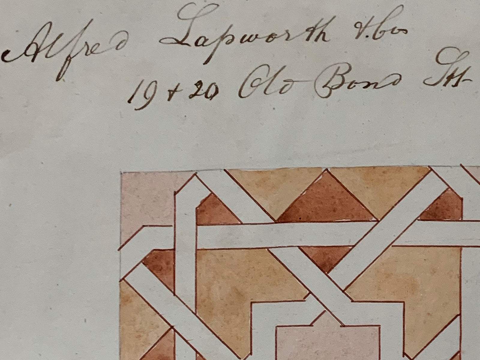 Currently investigating the activities and output of this London Bond Street supplier who purchased Wilton Carpet Company (1860) made carpets for St. George's Chapel Windsor (1842/3)  Great Exhibition (1851). Alfred Lapworth & Co, Carpet were Manufacturers to Her Majesty & the Royal Family, 22 Old Bond Street, London. Also possibly at 19/20 Old Bond Street.