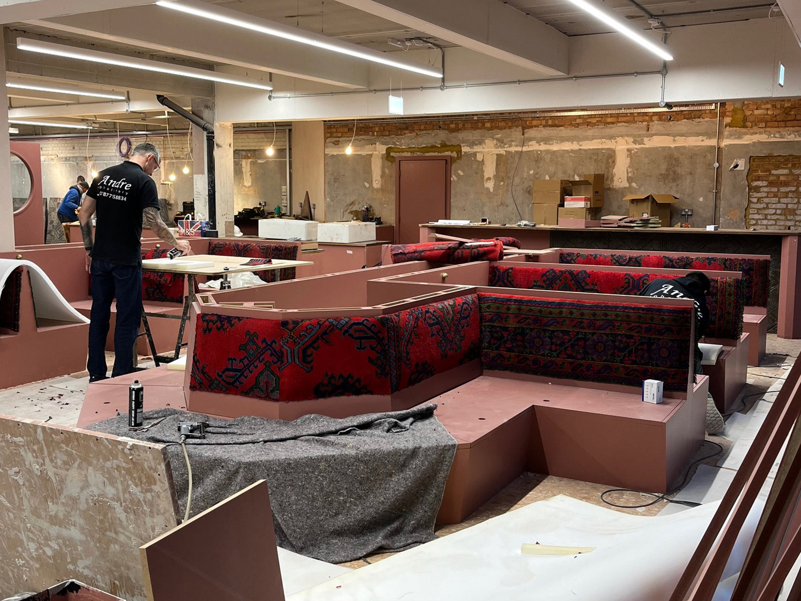 The ORU SPACE project to repurpose a disused department store in Surrey, (England), successfully and cleverly recycled otherwise discarded pieces of old antique Turkey carpets as banquettes. The supply of such material old or new is a facet of our business, in that we are occasionally requested to supply upholstery material, particularly in commercial premises where a robust solution is called for. Another similar project but not with Joanne, was done for Barter Books in Alnwick, Northumberland using flatweave kilims.