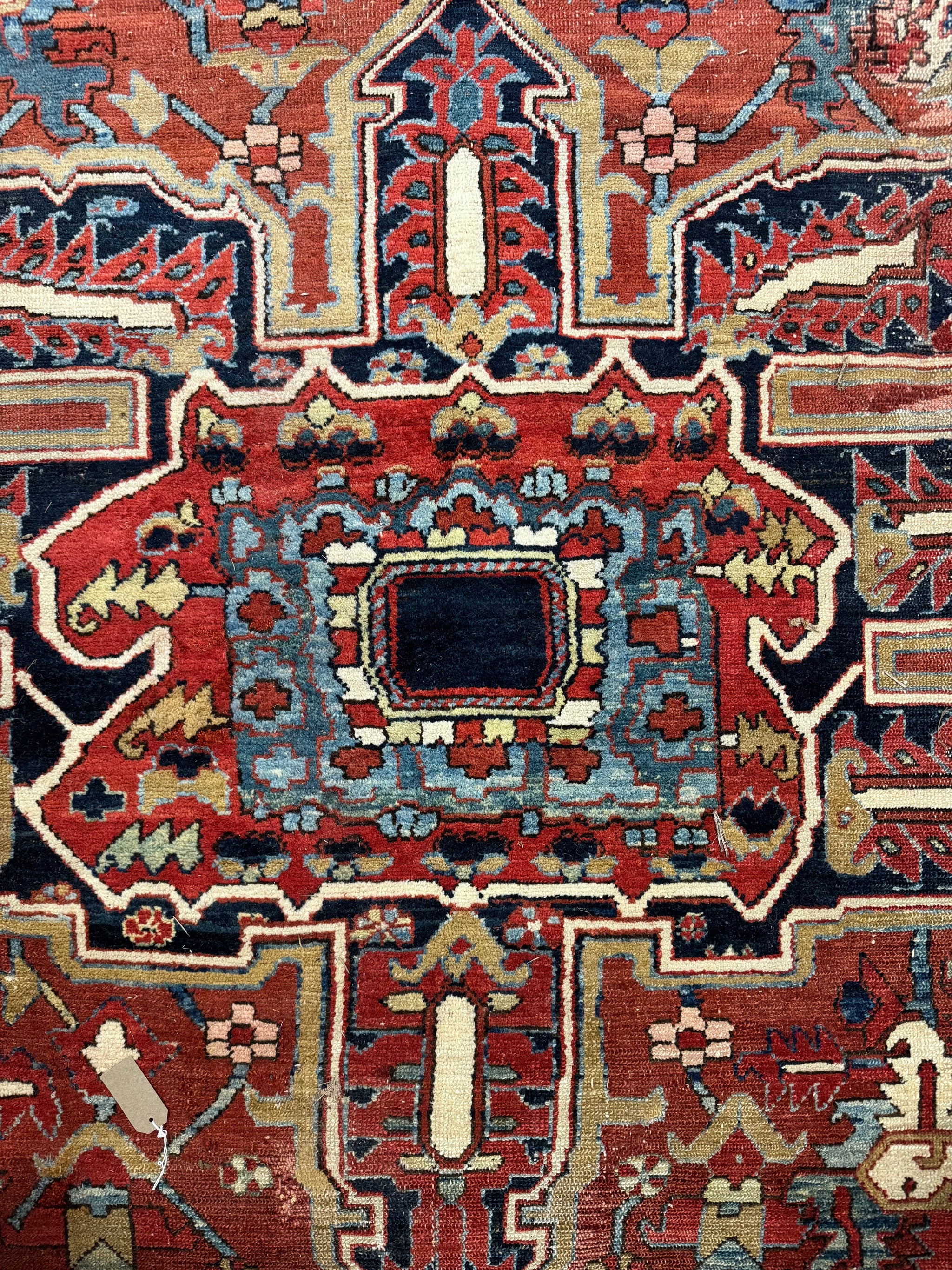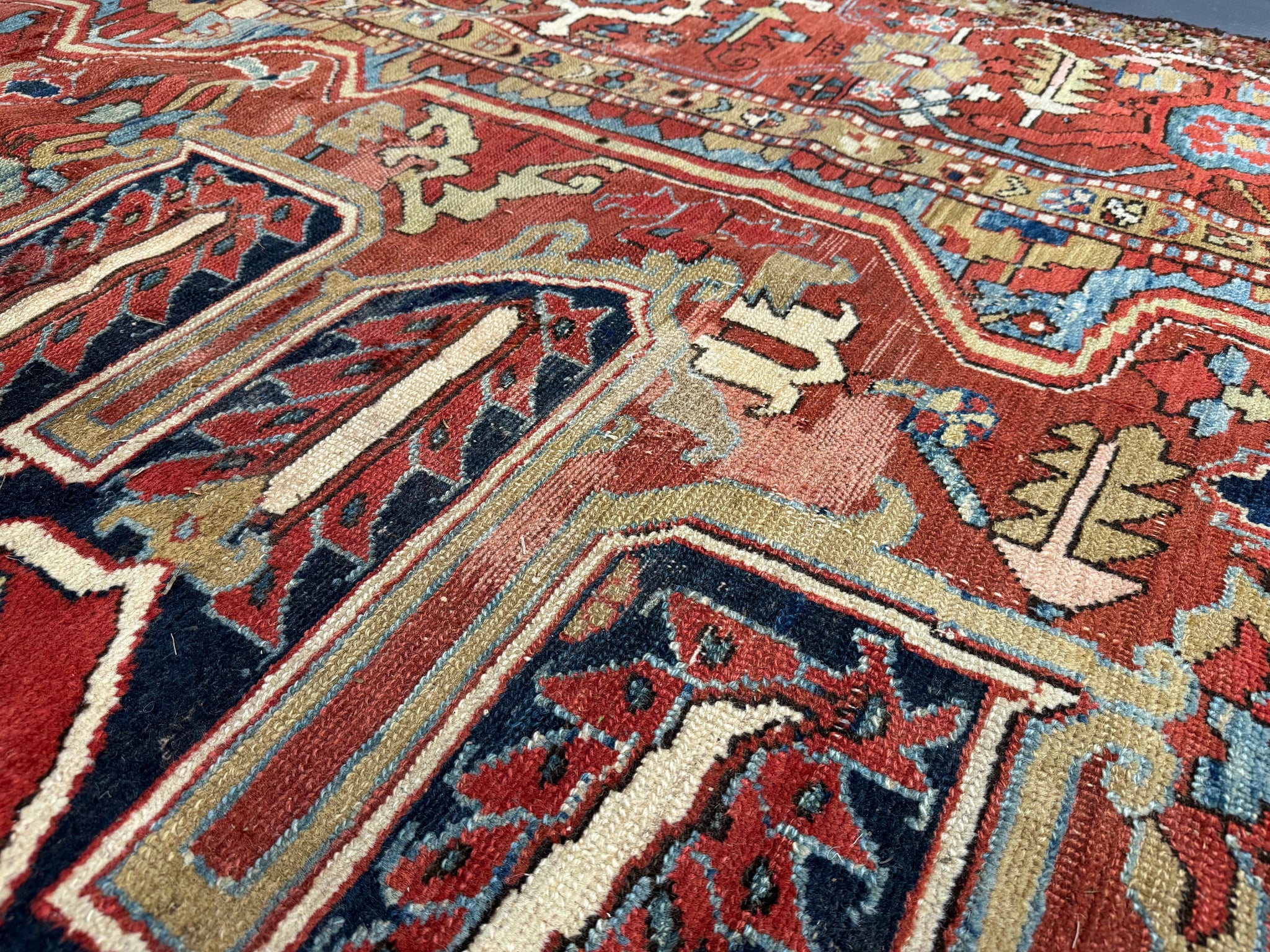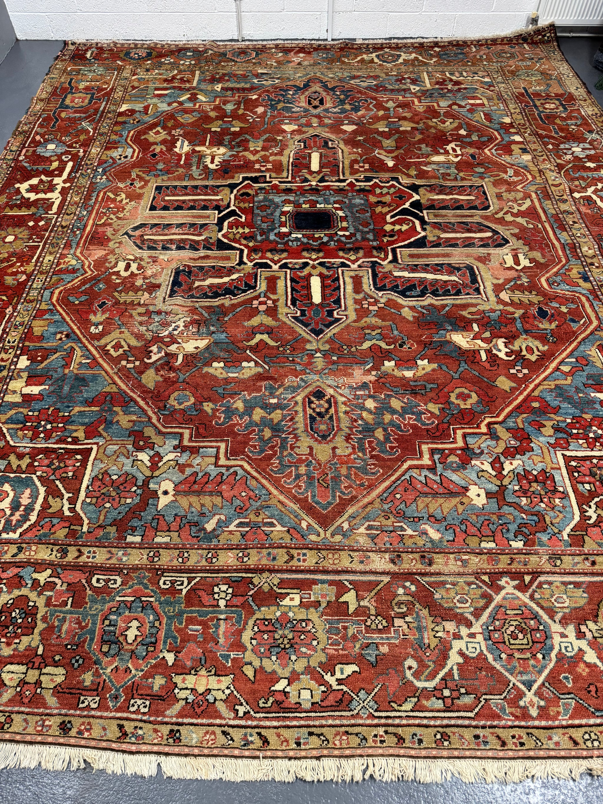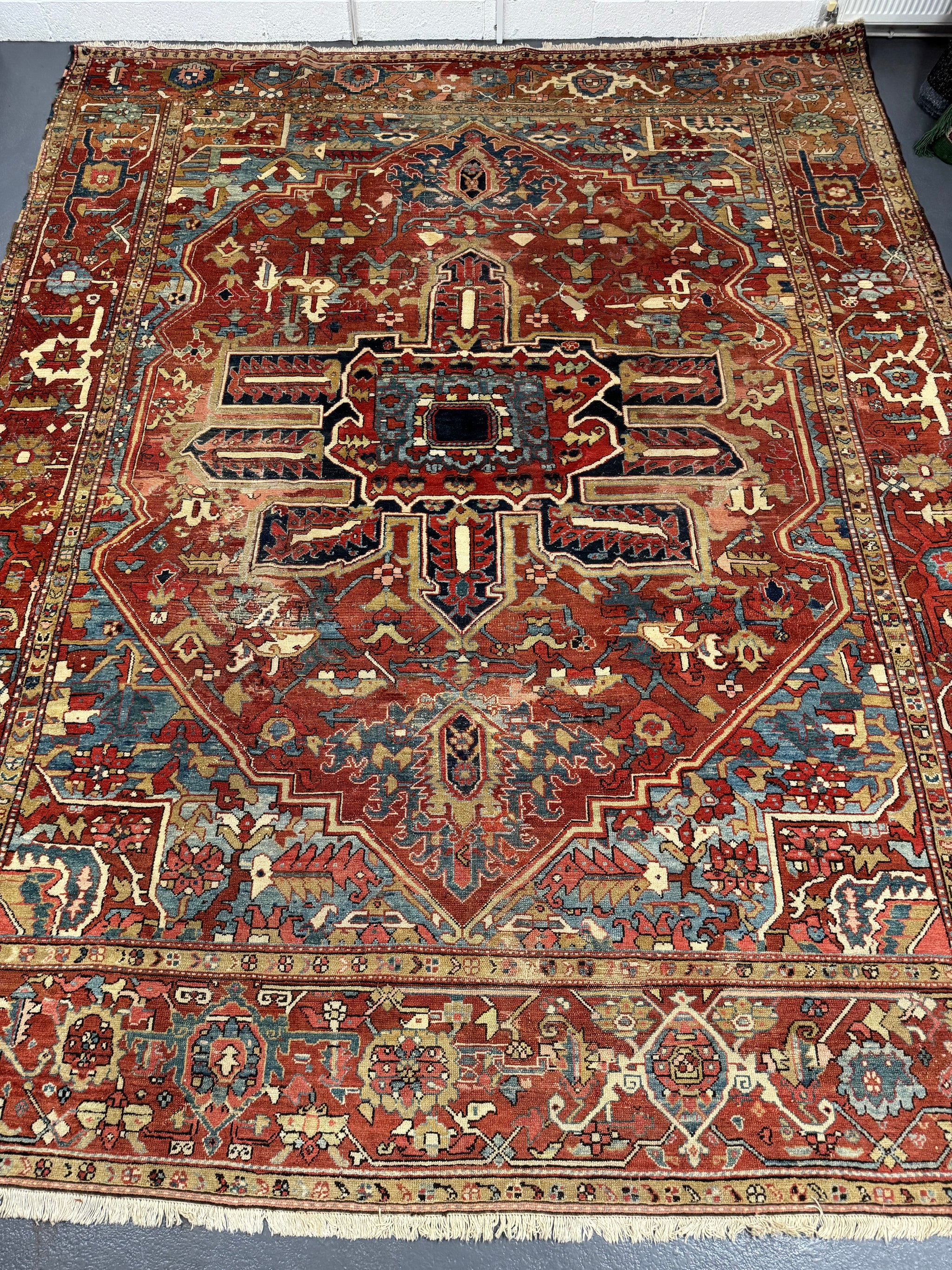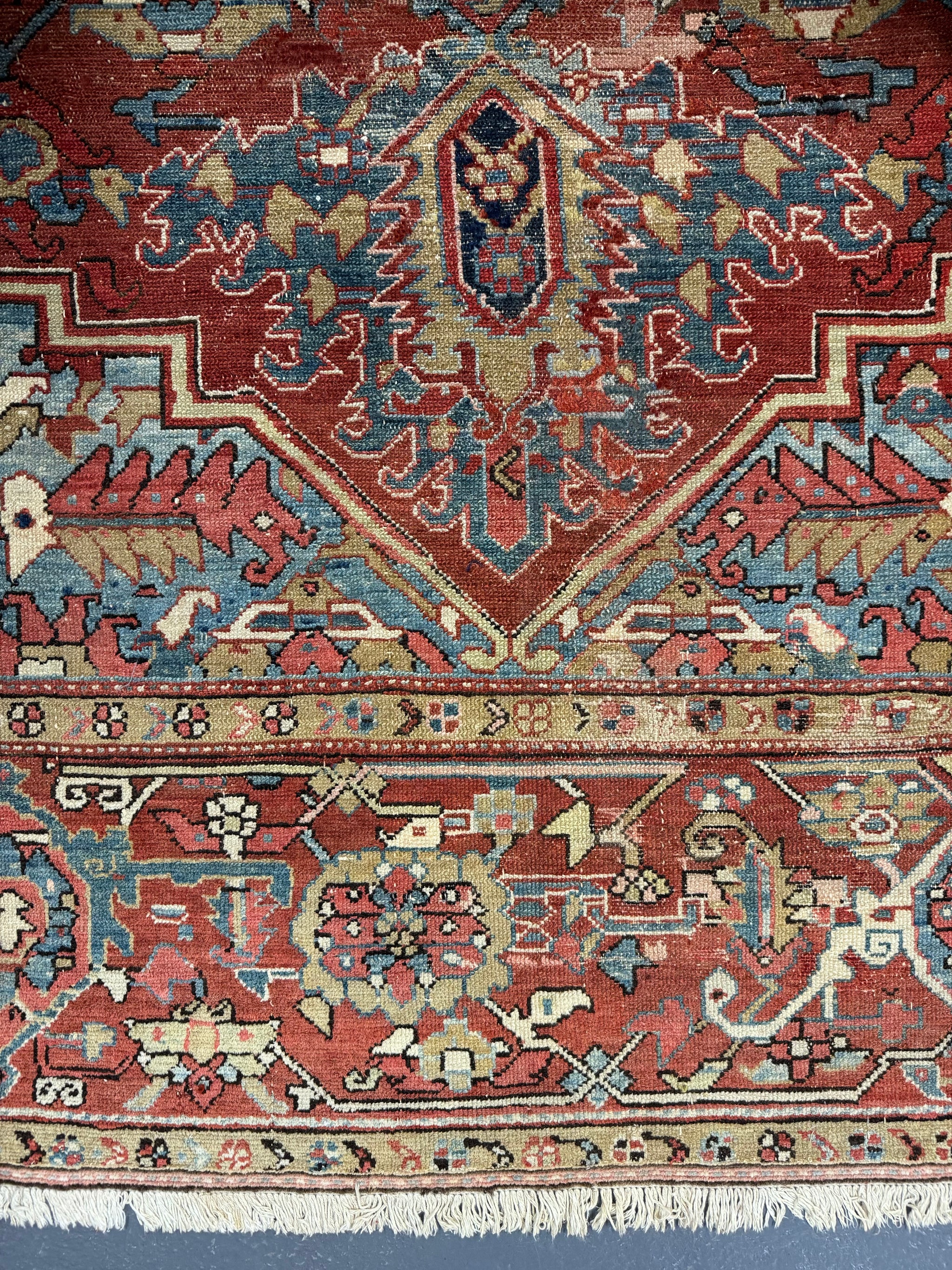 This antique carpet has all the desirable qualities in a relaxed design and colour of truly antique Heriz carpets. The end borders are re-woven and there are worn parts and repairs in places but the carpet is substantially sound.