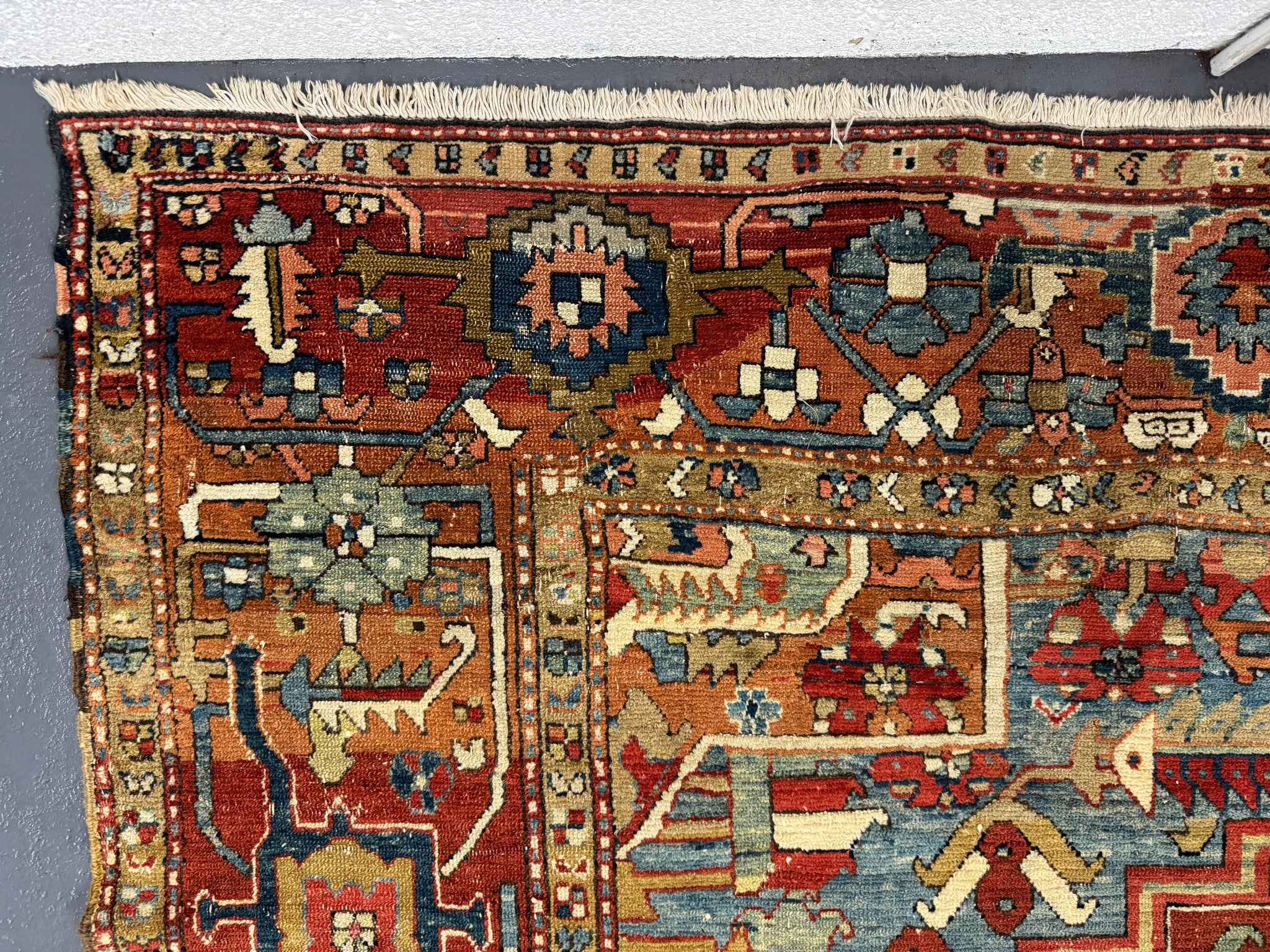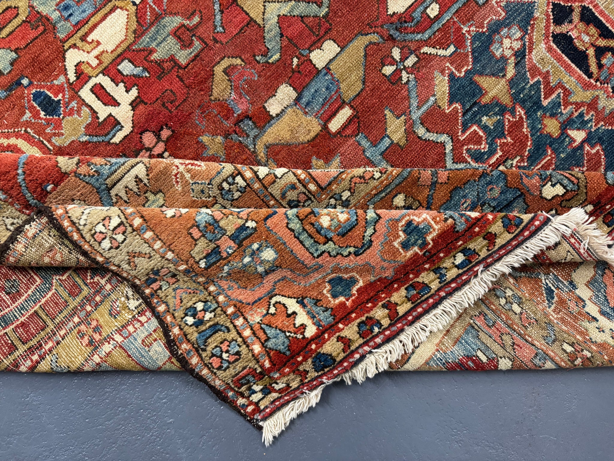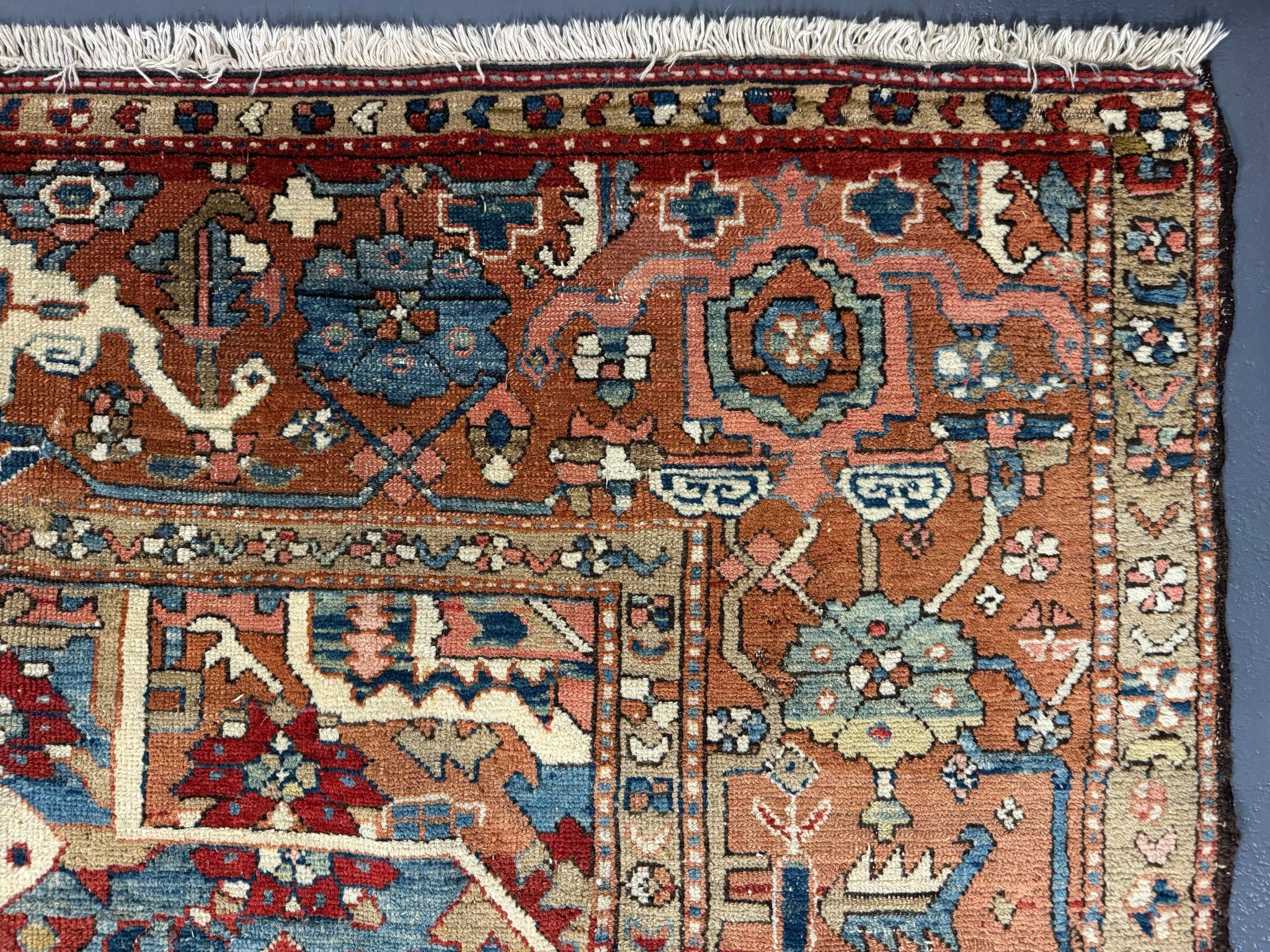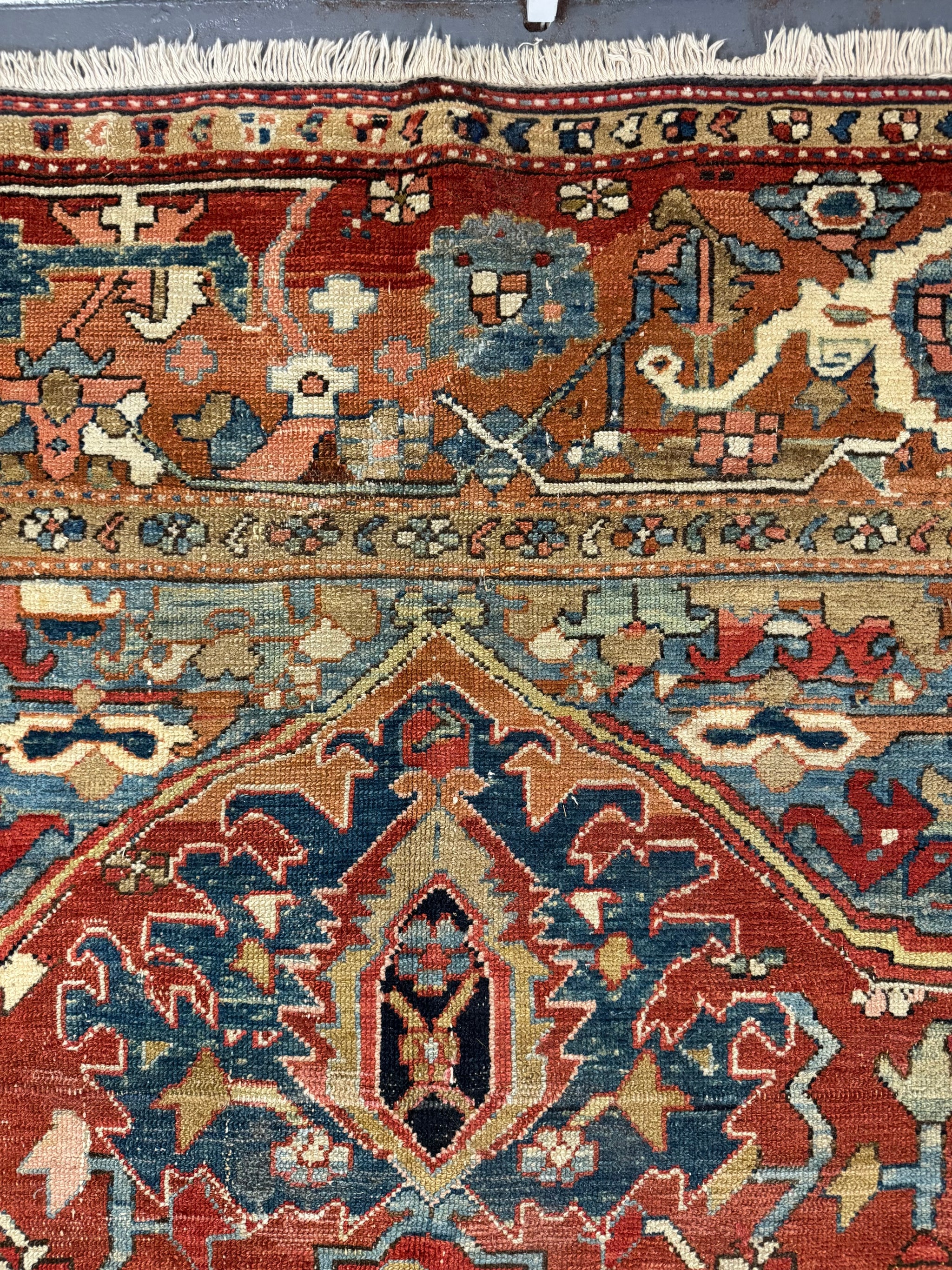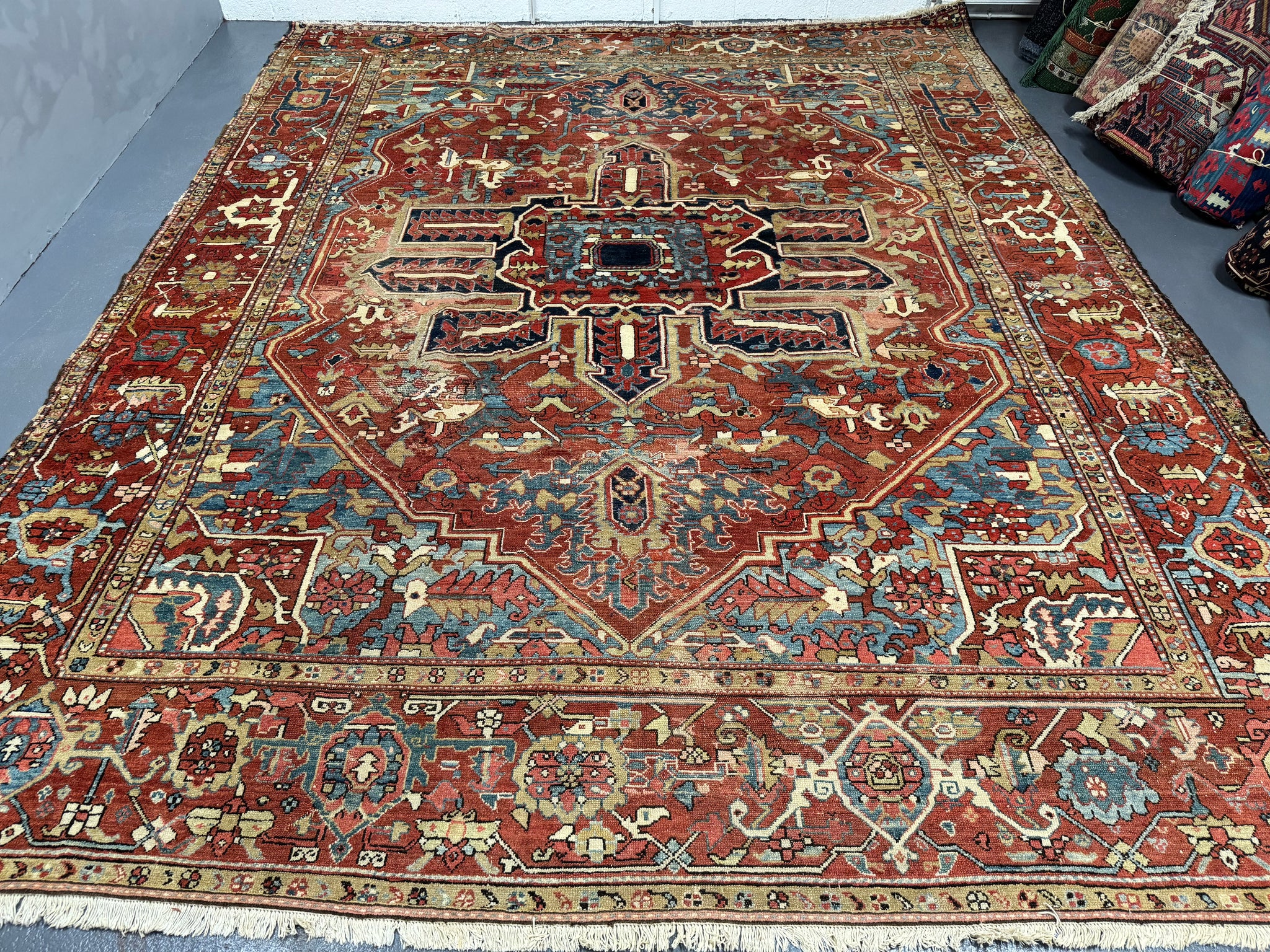 This antique carpet has all the desirable qualities in a relaxed design and colour of truly antique Heriz carpets. The end borders are re-woven and there are worn parts and repairs in places but the carpet is substantially sound.