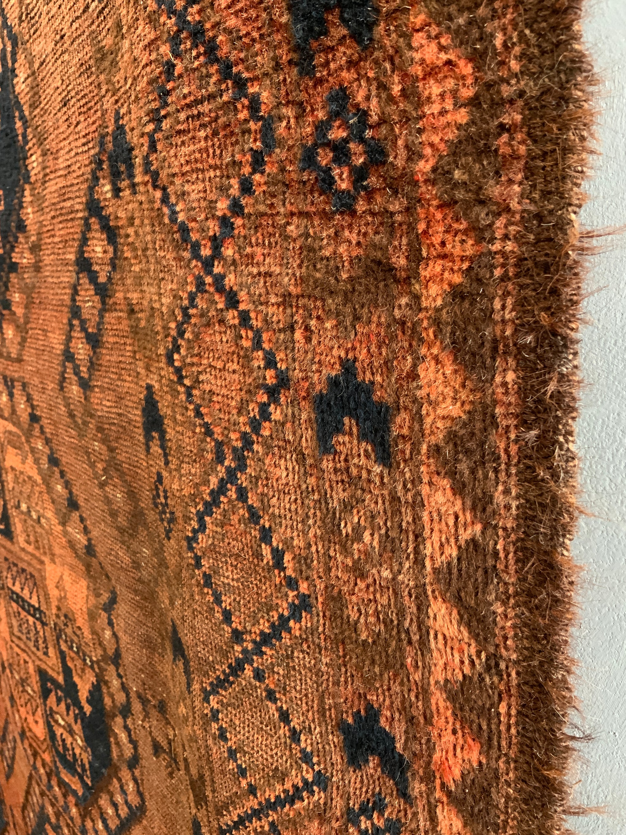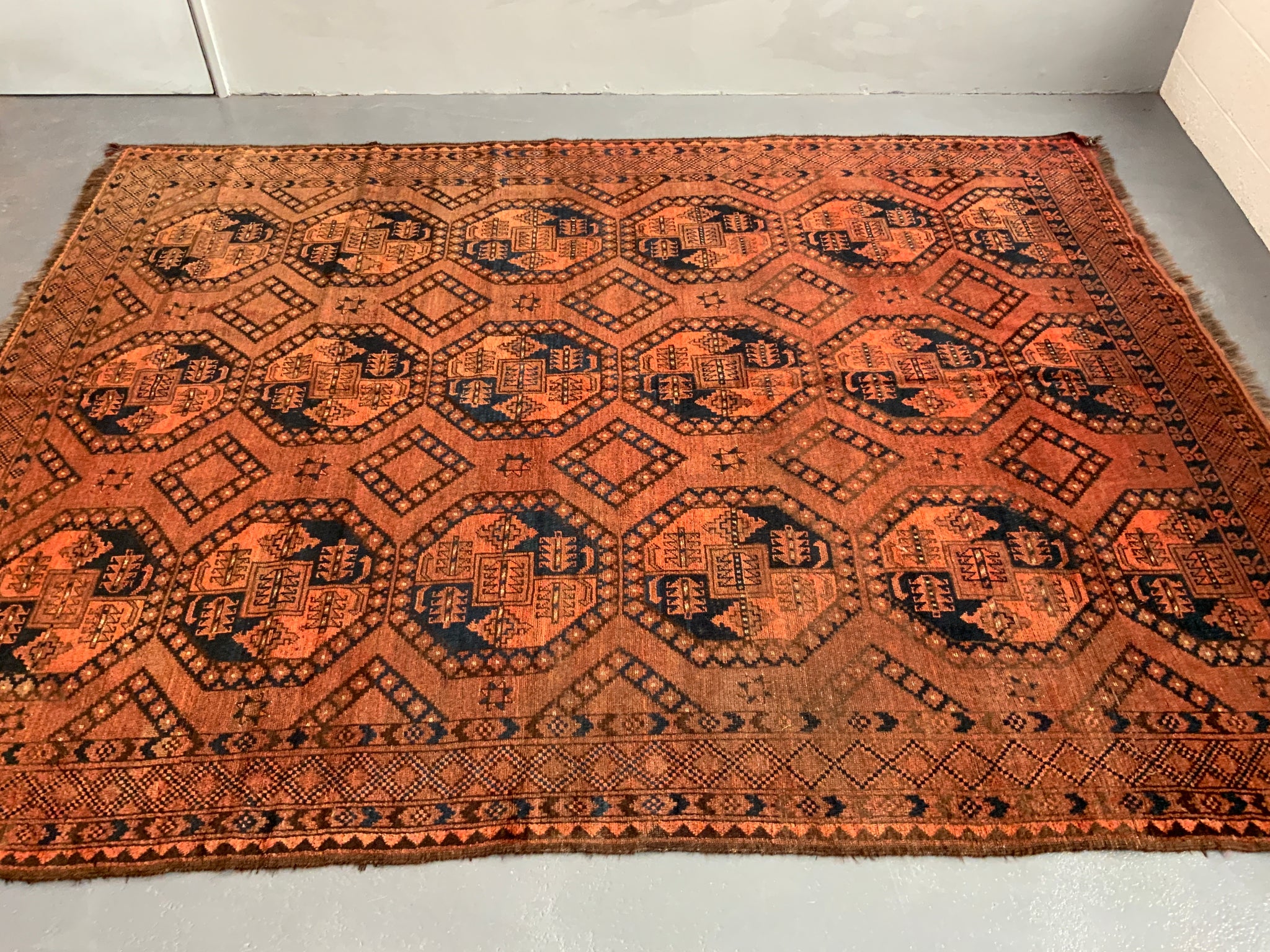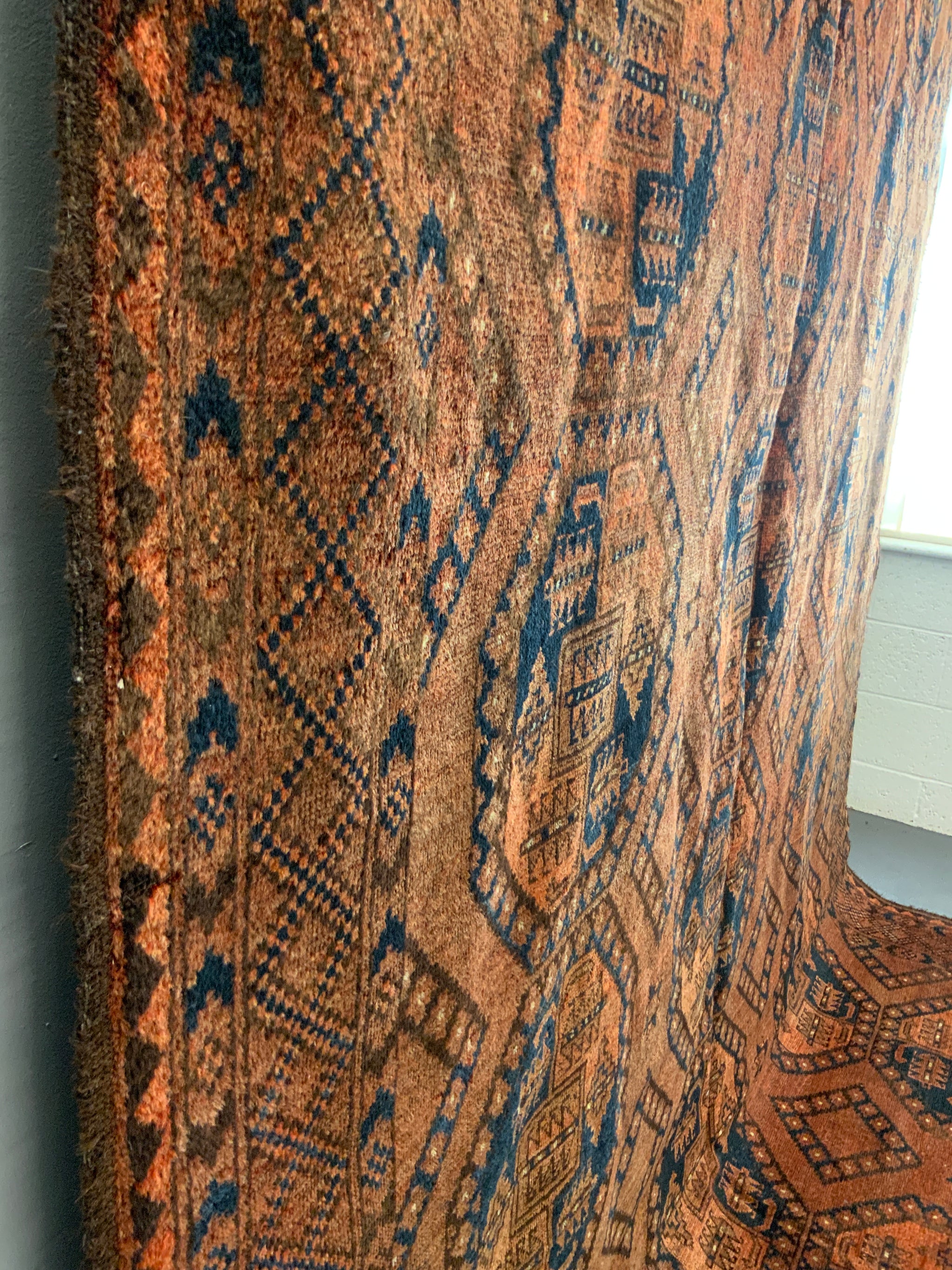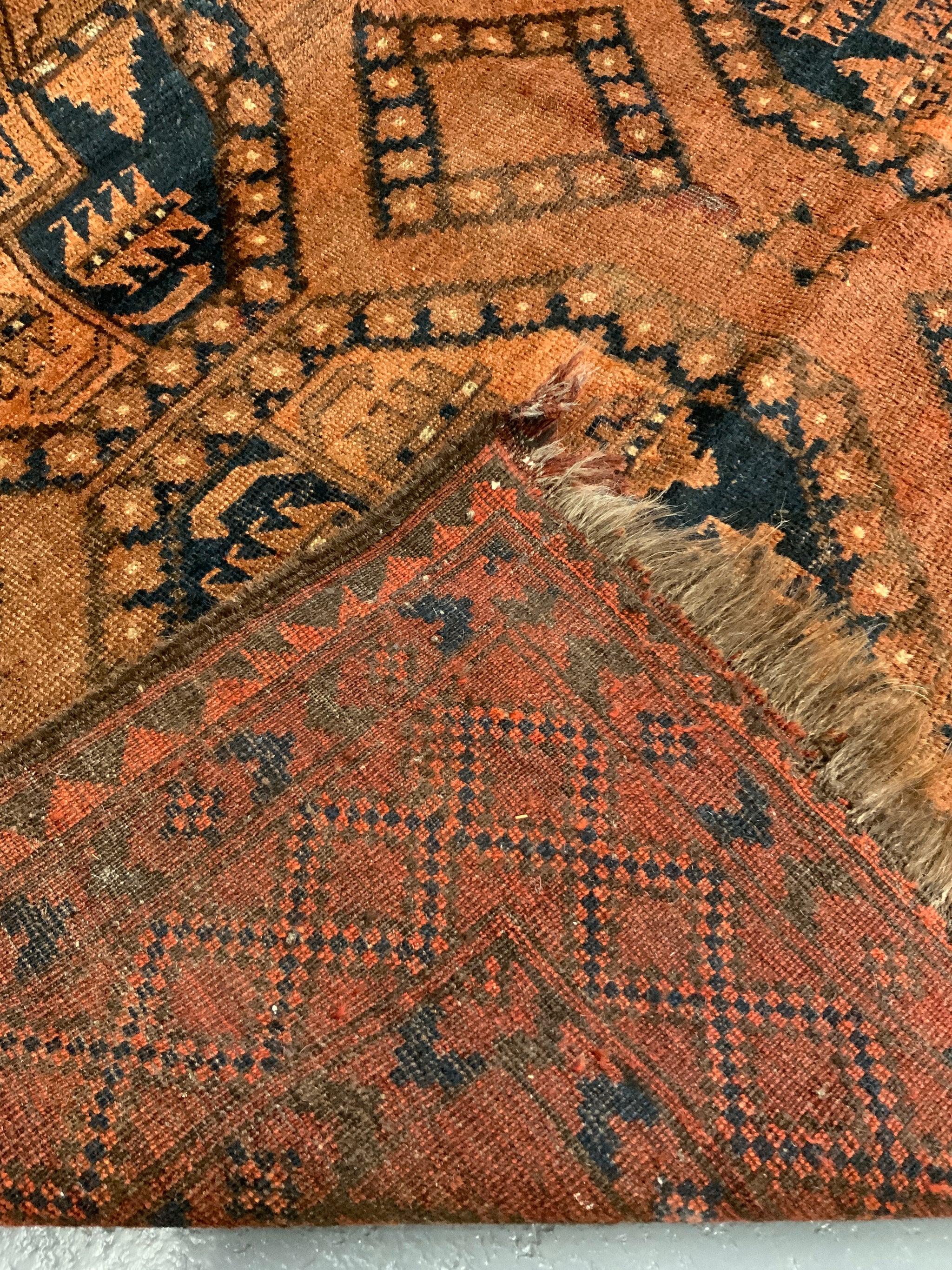 This characterful piece has mellowed relatively evenly to a handsome copper brown colour - not without charm. One corner area less so but our photos showcase the overall appearance. The carpet offers excellent value despite some uneven wear commensurate with age.