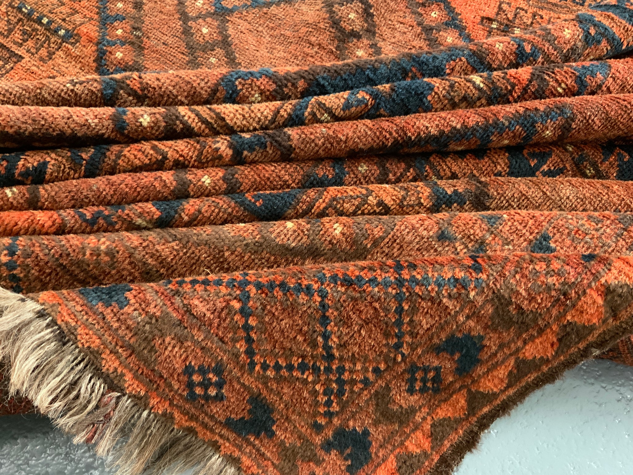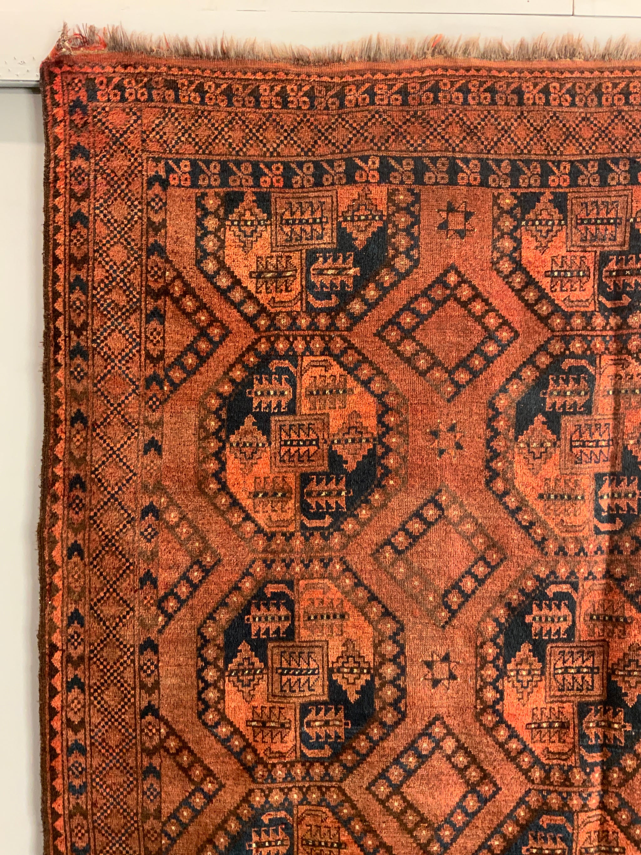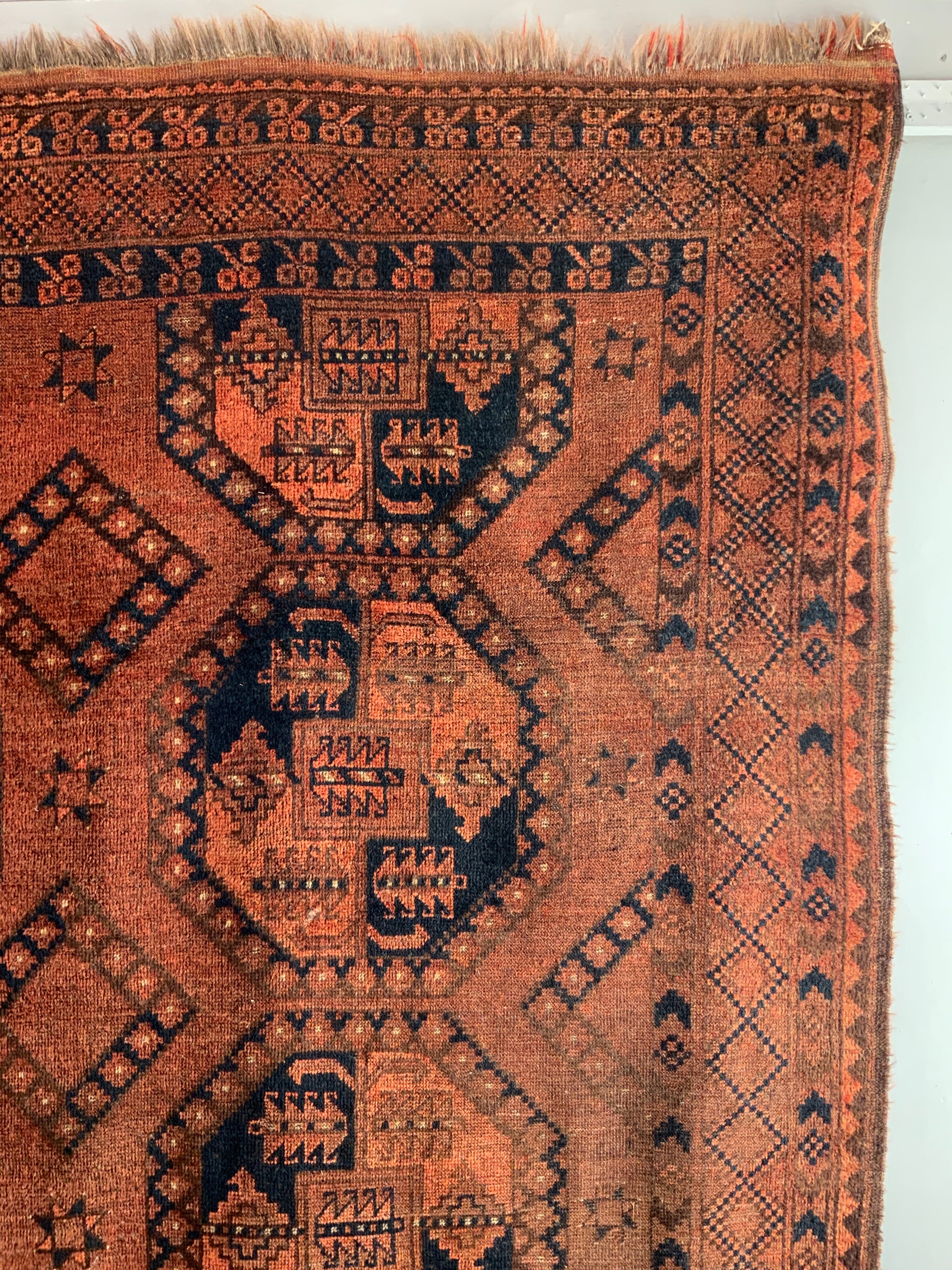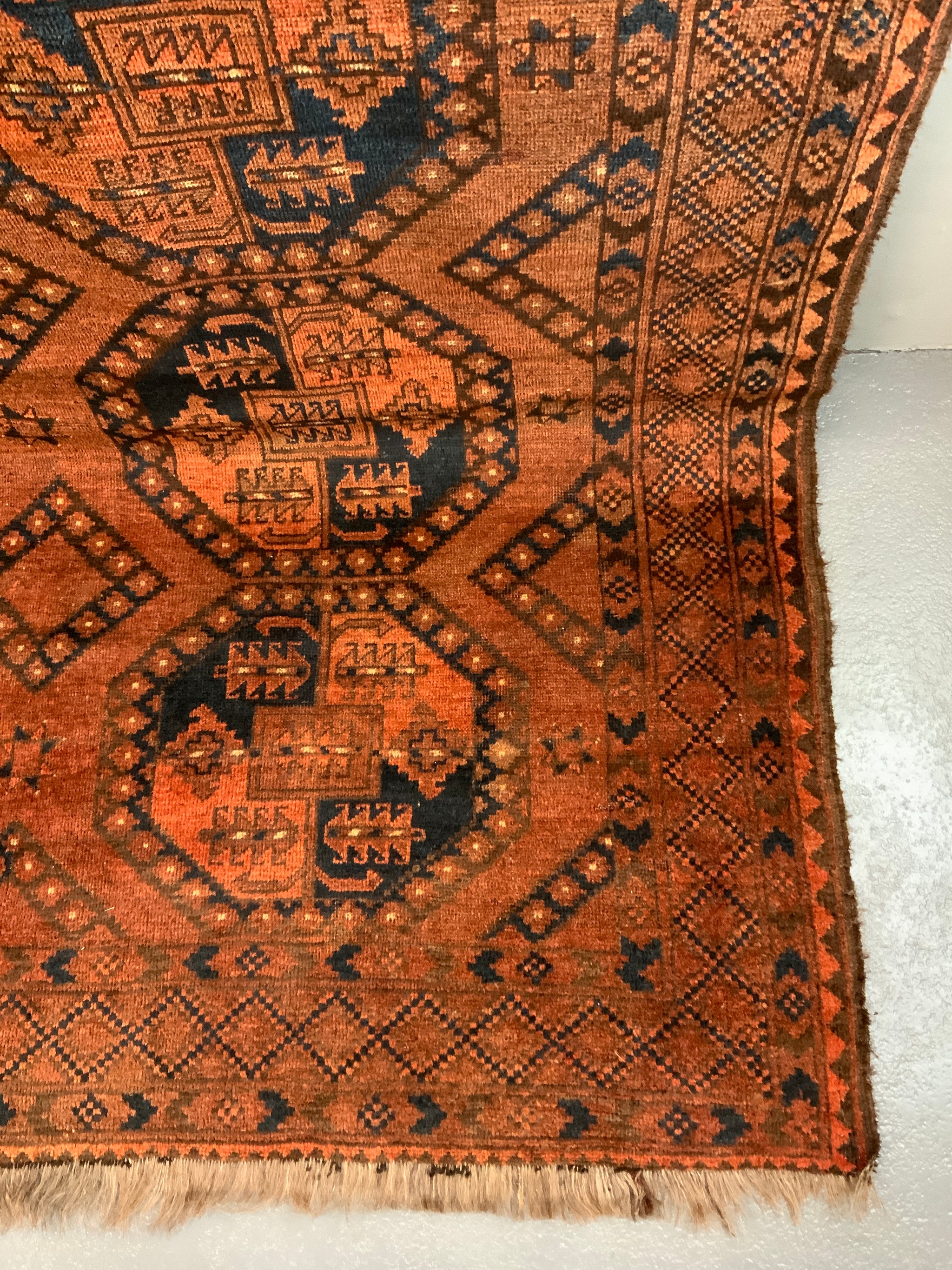 This characterful piece has mellowed relatively evenly to a handsome copper brown colour - not without charm. One corner area less so but our photos showcase the overall appearance. The carpet offers excellent value despite some uneven wear commensurate with age.