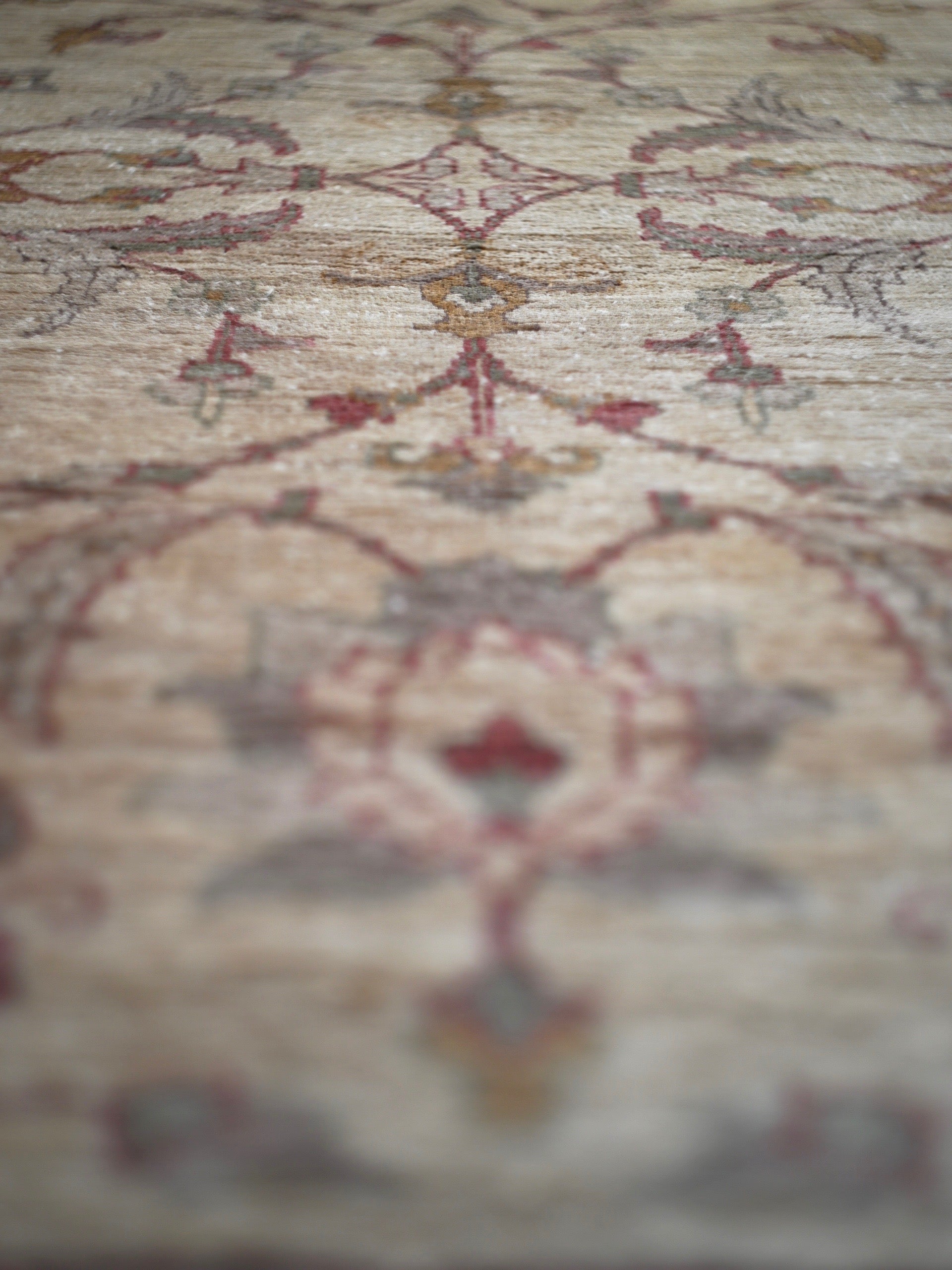 The toned down pale scheme of the carpet betrays the solid hardy construction of this modern carpet. The pile is not long and the feel is rather hard with a shiny patina. A few very minor defects . The carpet has been fully washed.