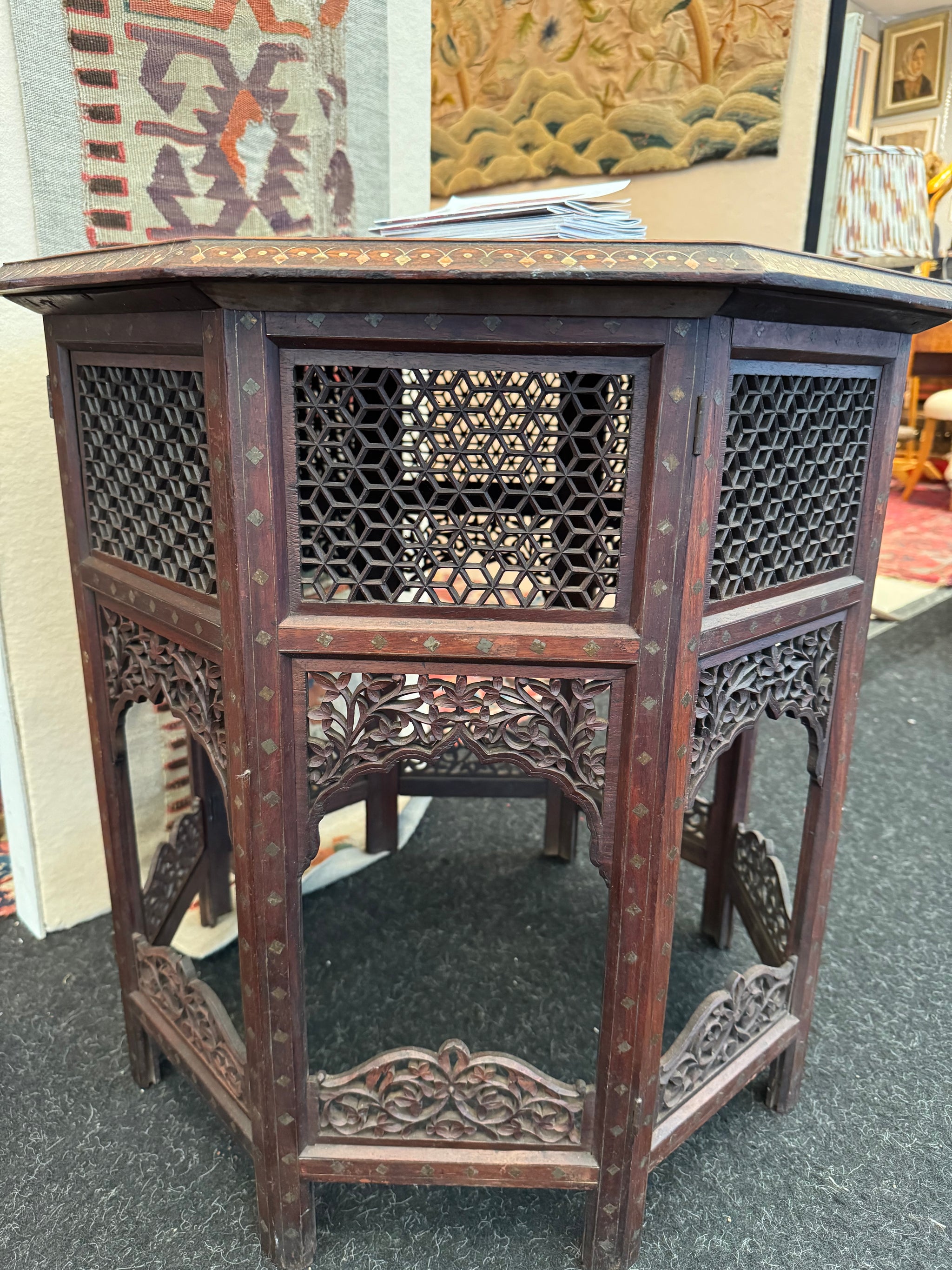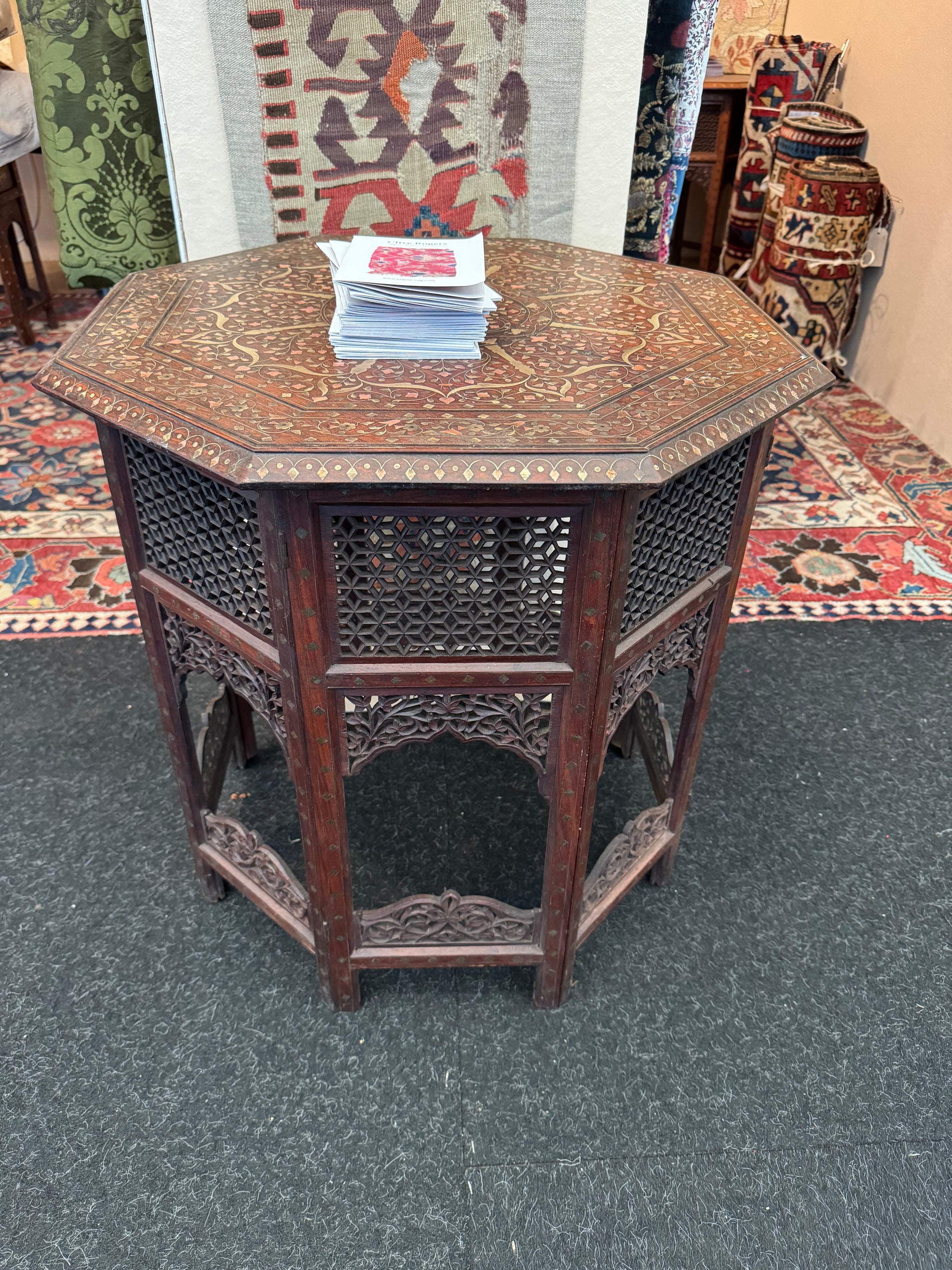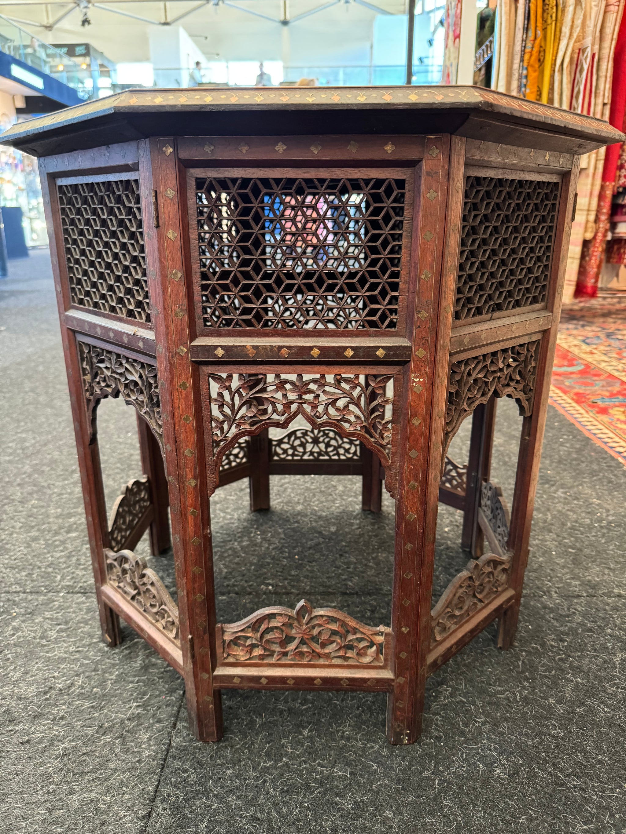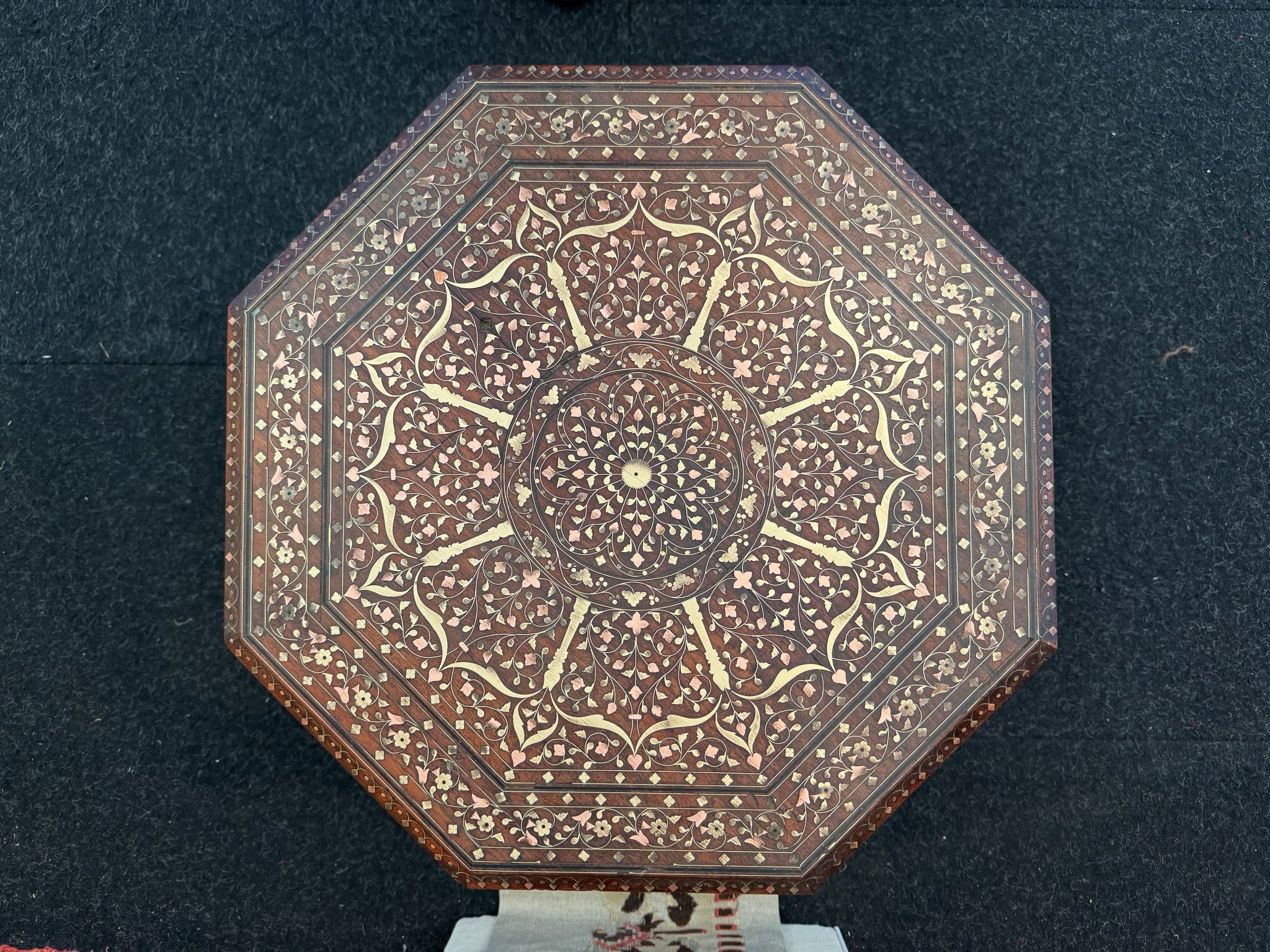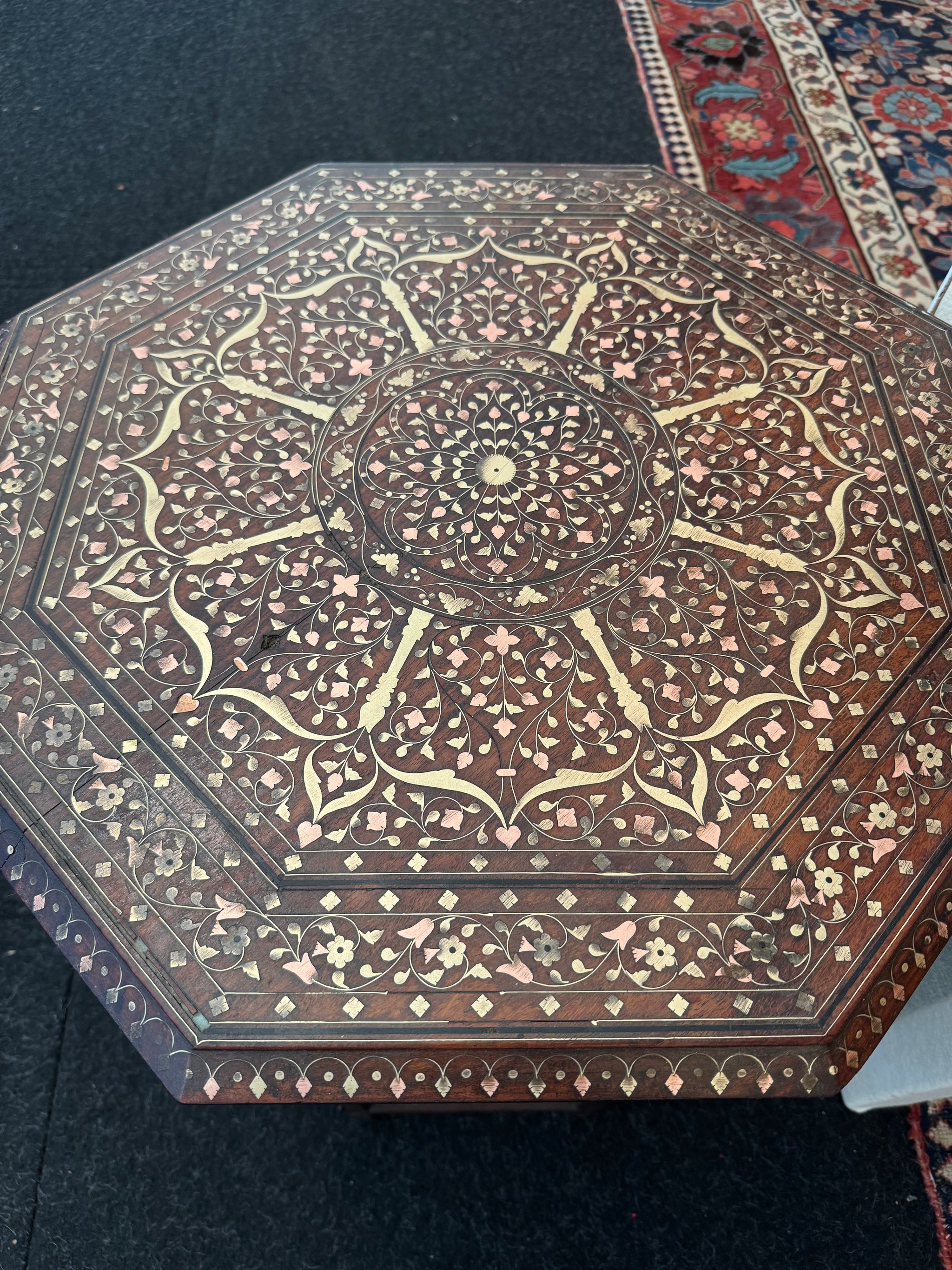 A crucial adaptation of these octagonal tables (and other Punjabi furniture) was the folding action of the legs separating from the under-lipped top, leaving the two parts to pack flat. This feature made it possible to export items easily to Britain where nearly all examples are found, since typically serving officers were easily able to bring bulky items by ship.