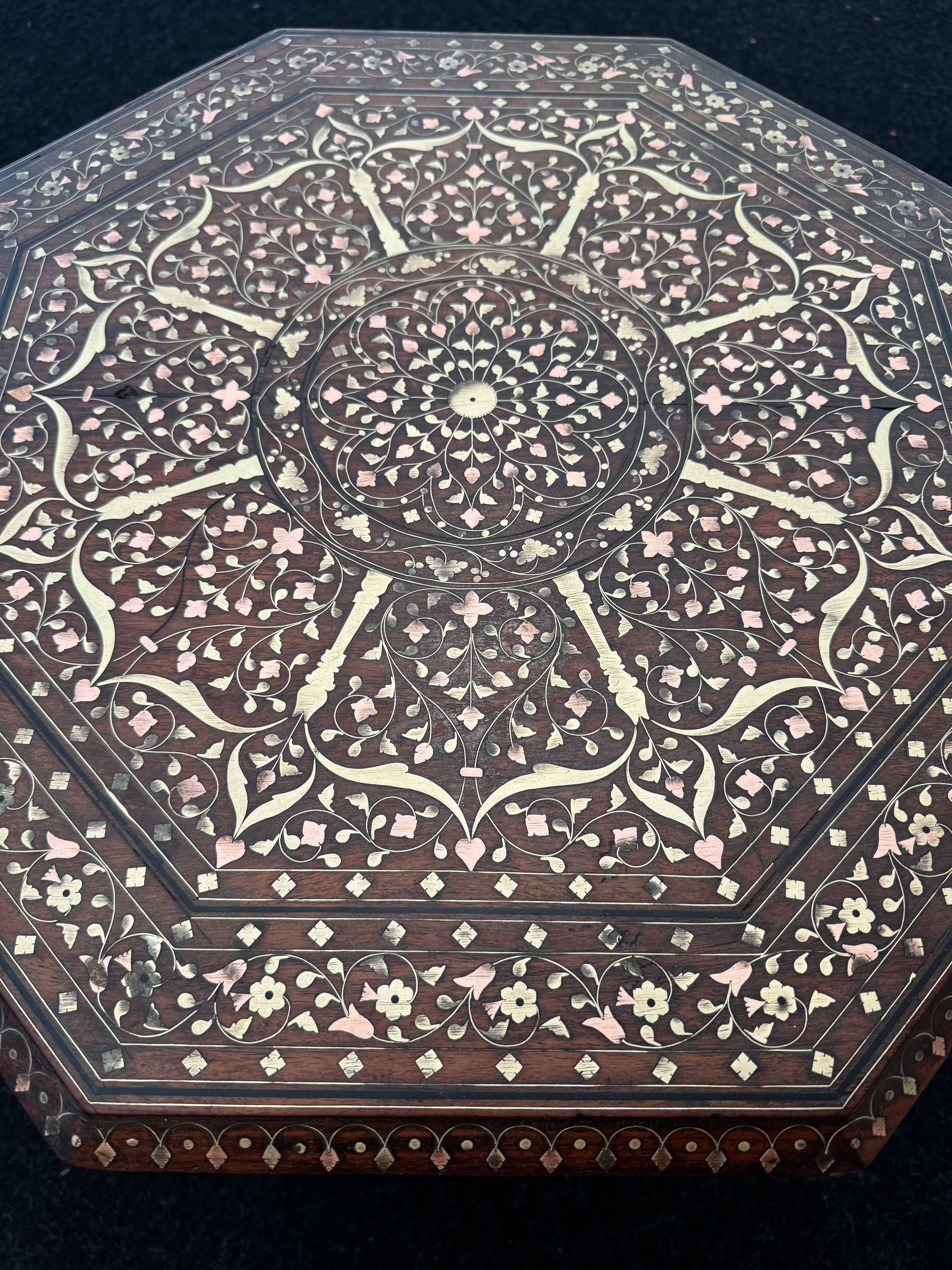 Hoshiapur furniture was inlaid with either ivory and ebony or brass, copper and ebony as per our example, with fretwork and carving to the under side supporting legs.