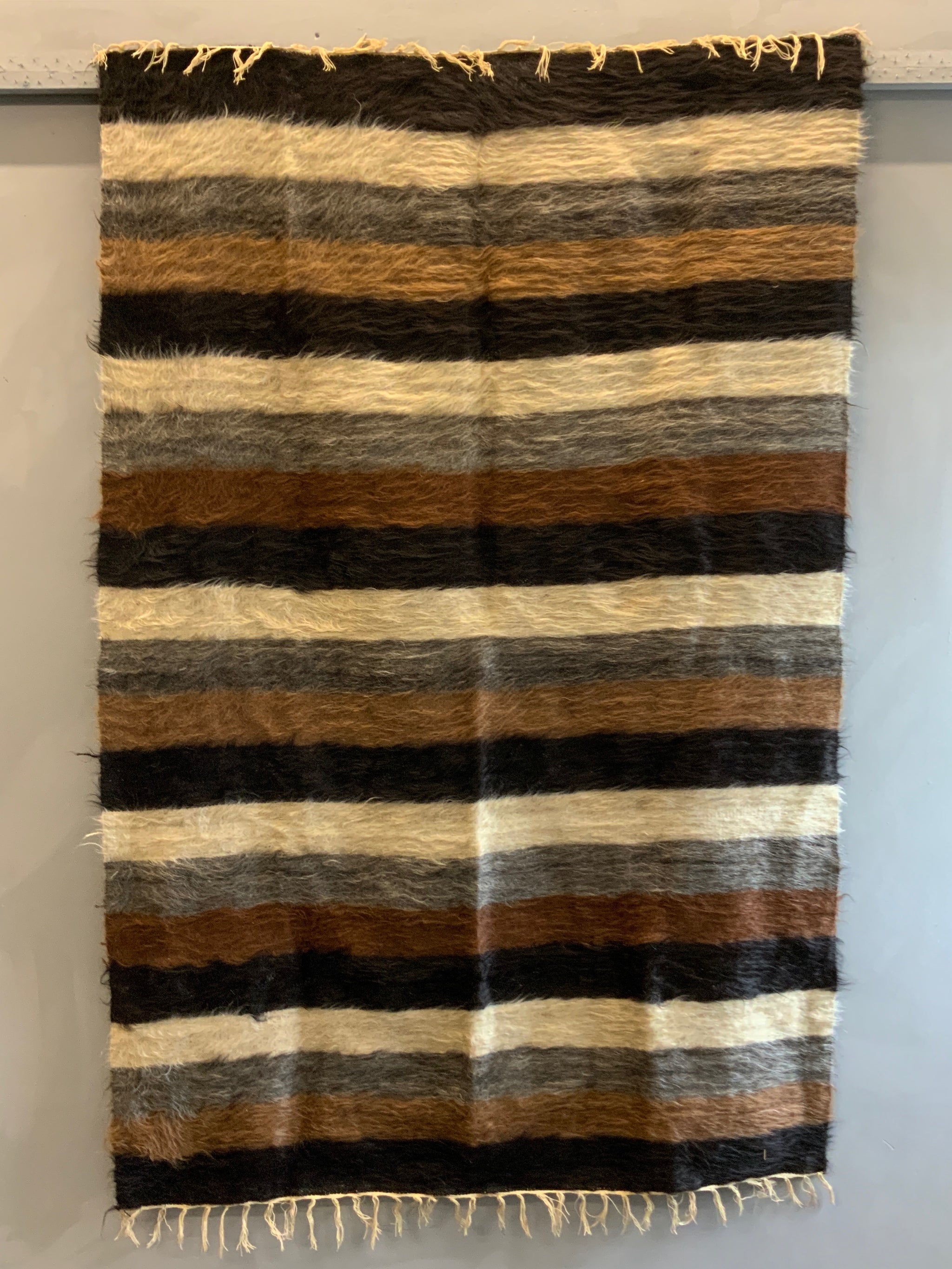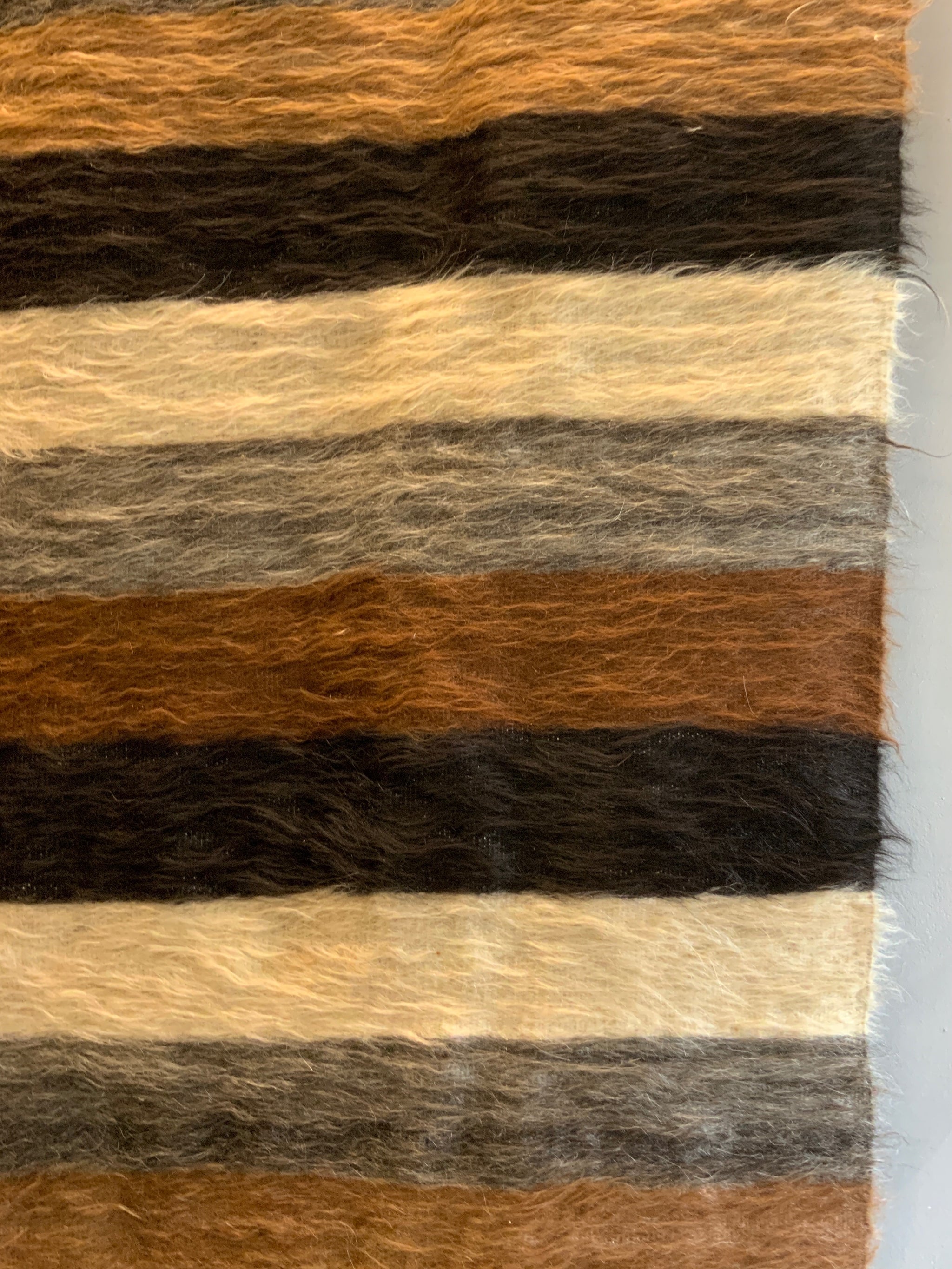 Of lightweight texture, woven in stripes with undyed naturally pigmented brushed angora ( goat ) mohair - best used as a throw or cover perhaps