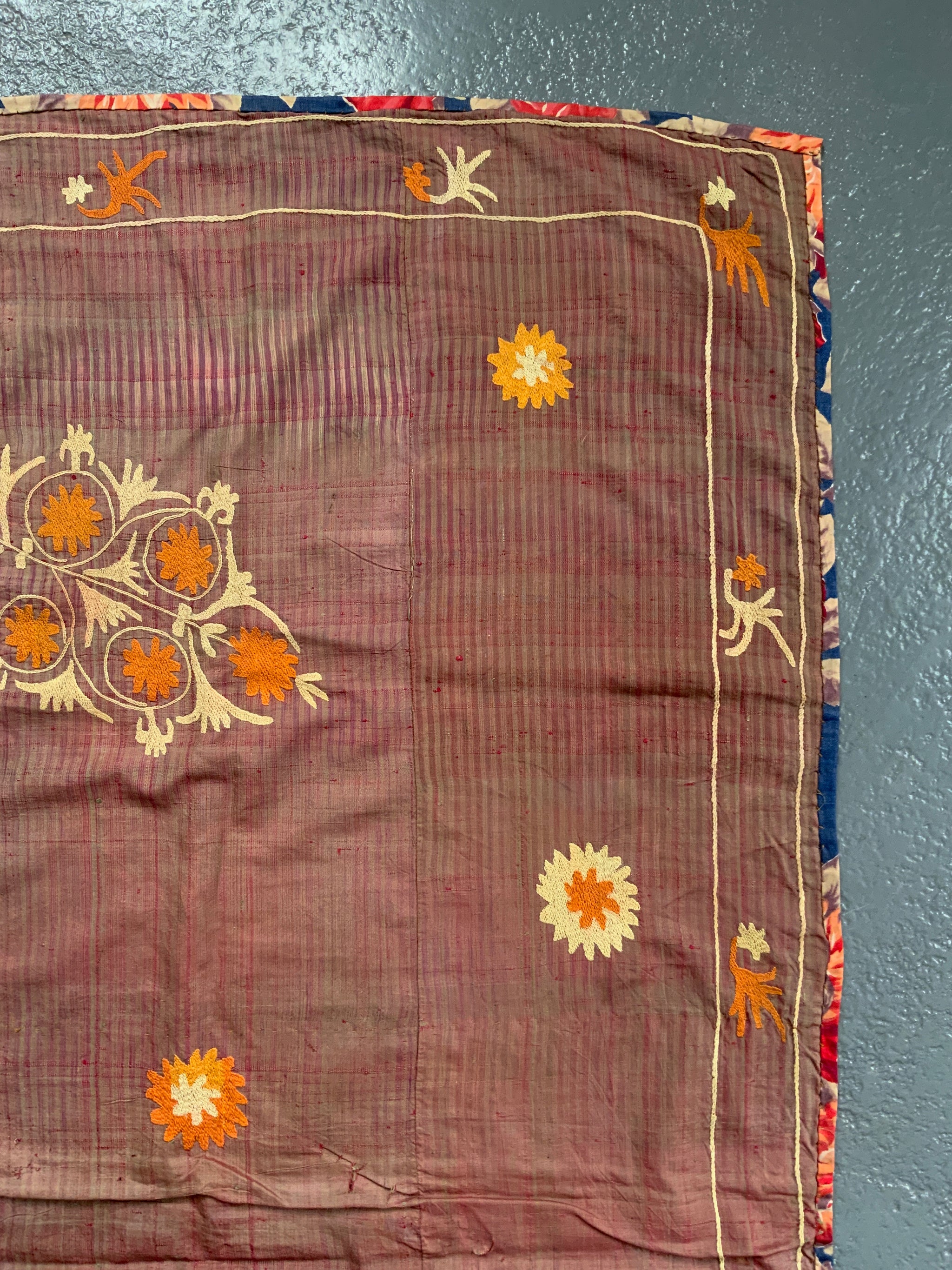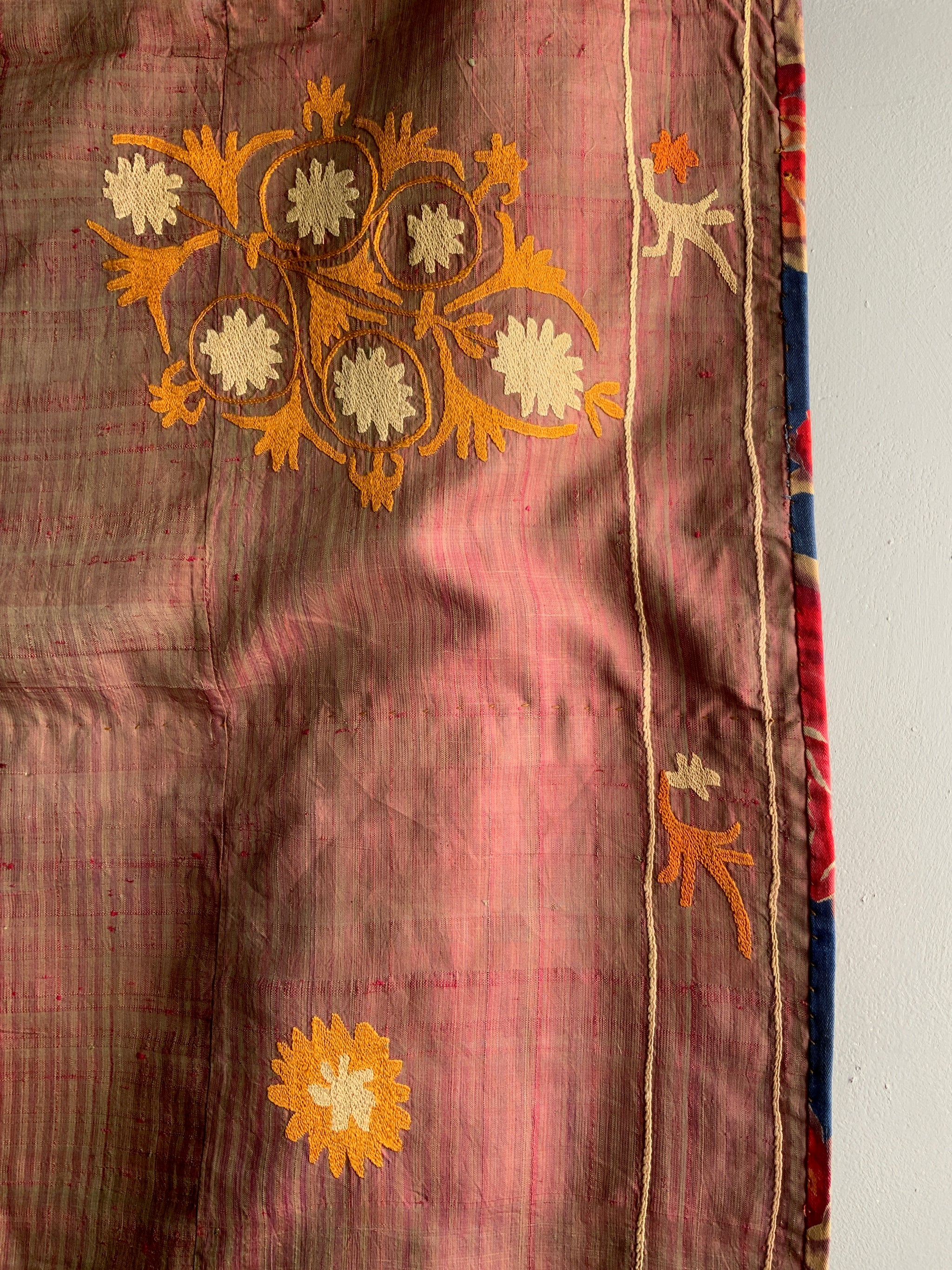 This large Ferghana embroidery is worked unusually on a stripped silk ground rather than a plain fabric. The style is typical of the sparser style of Andijan City in the eastern part of Ferghana Valley Uzbekistan
