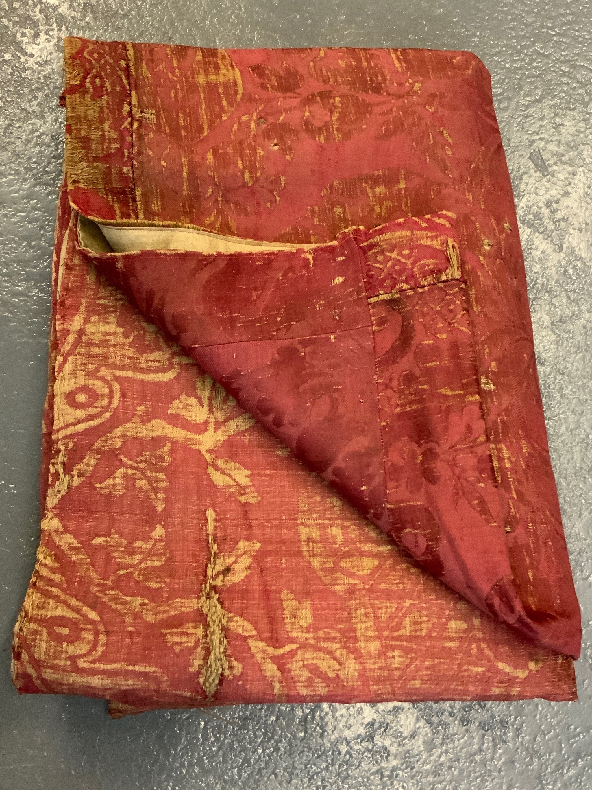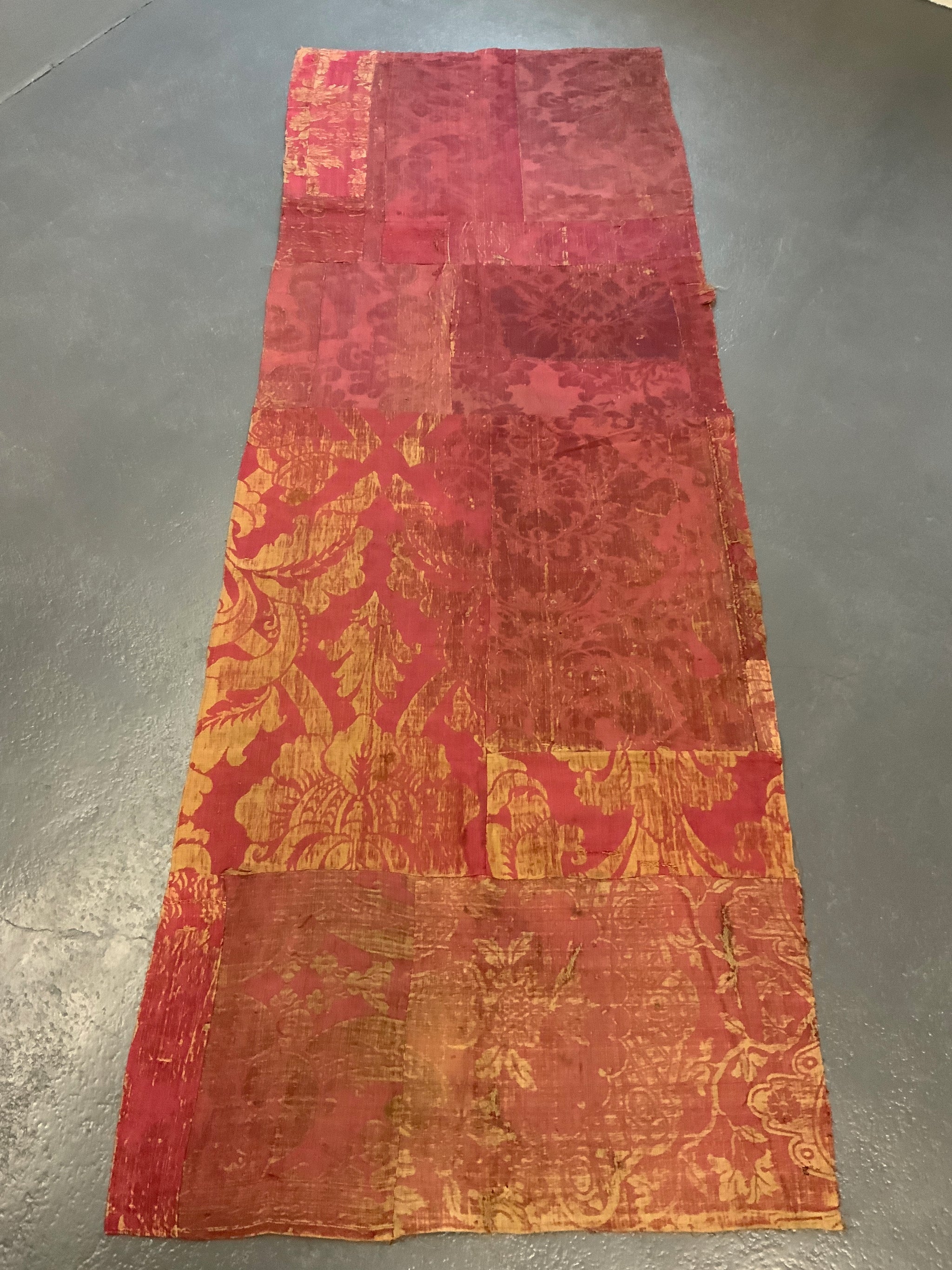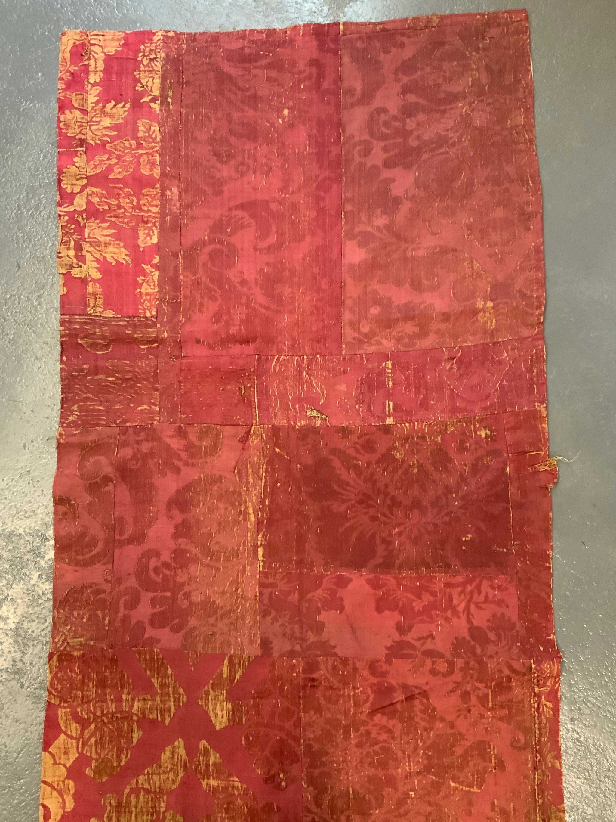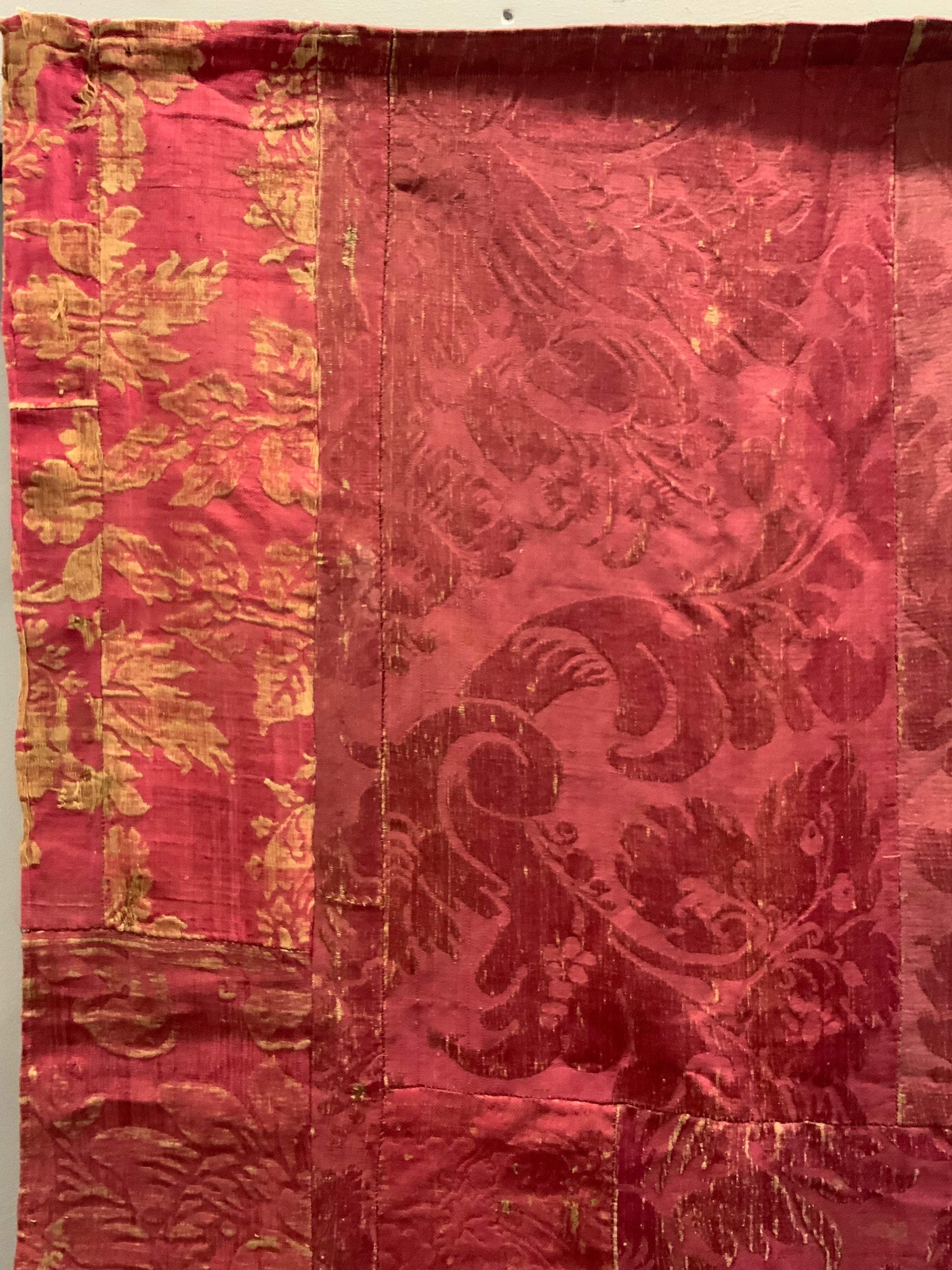 The hanging is made of several  parts of crimson antique silk damask into a collage for a finished hanging or curtain.