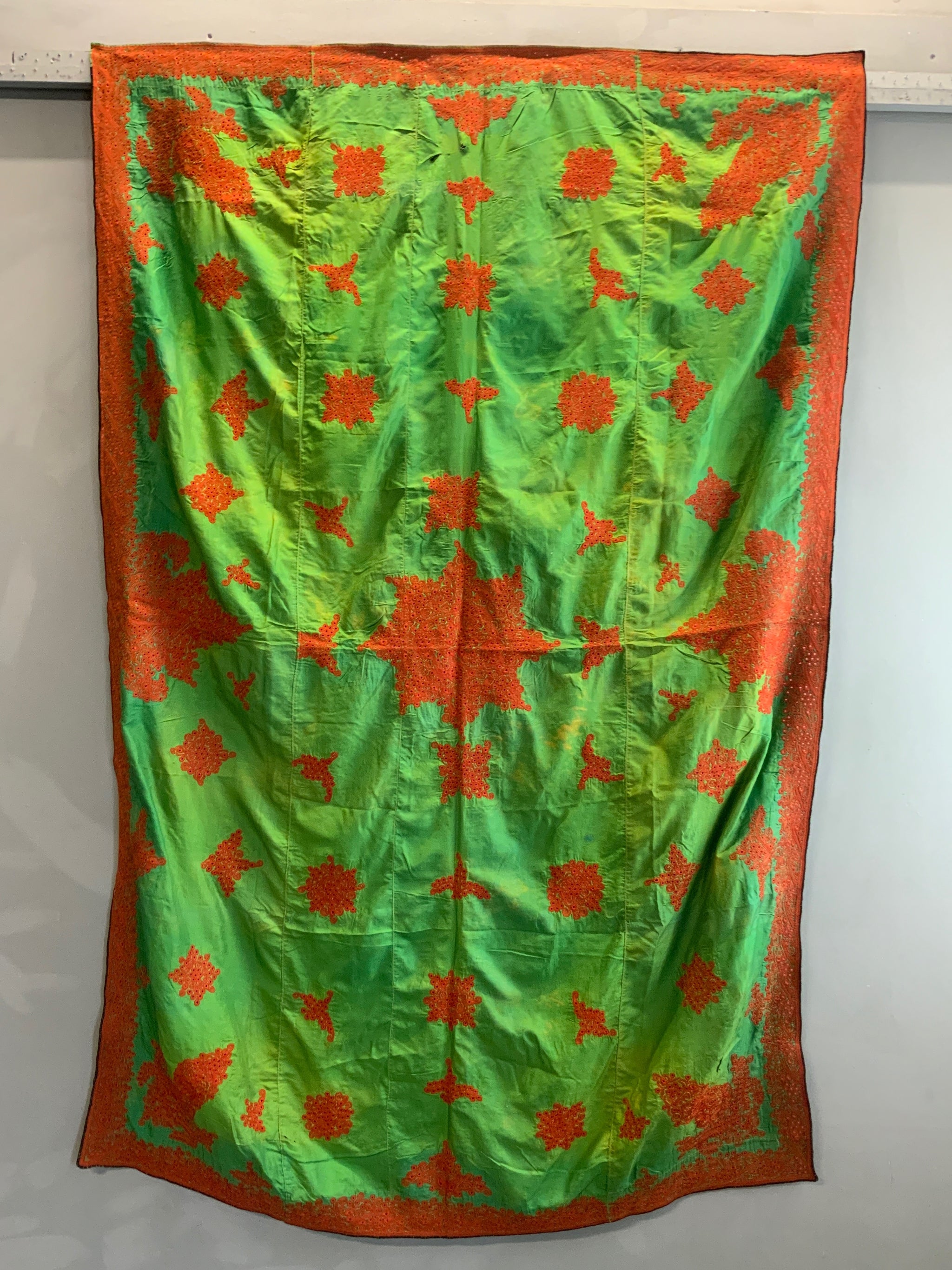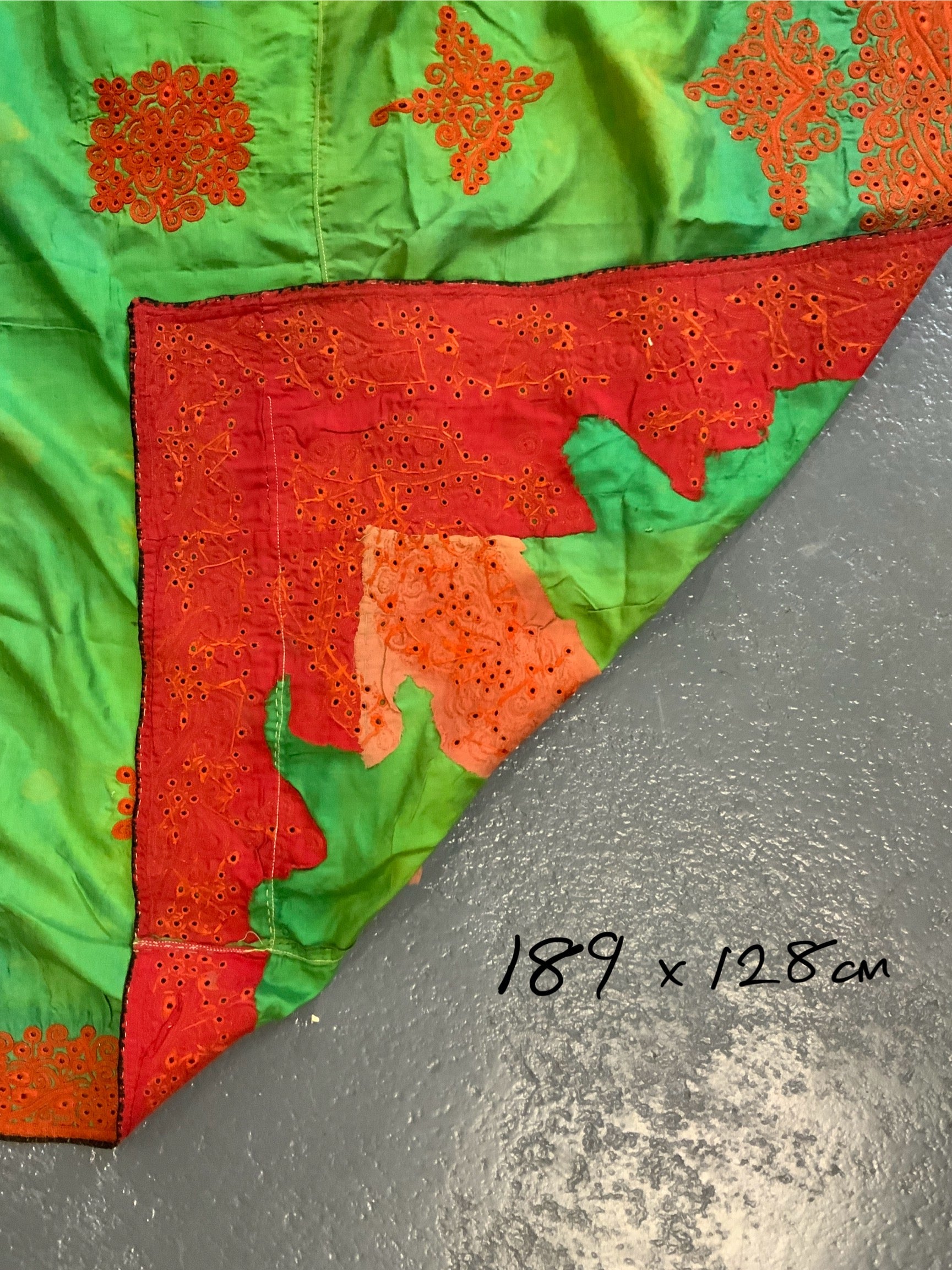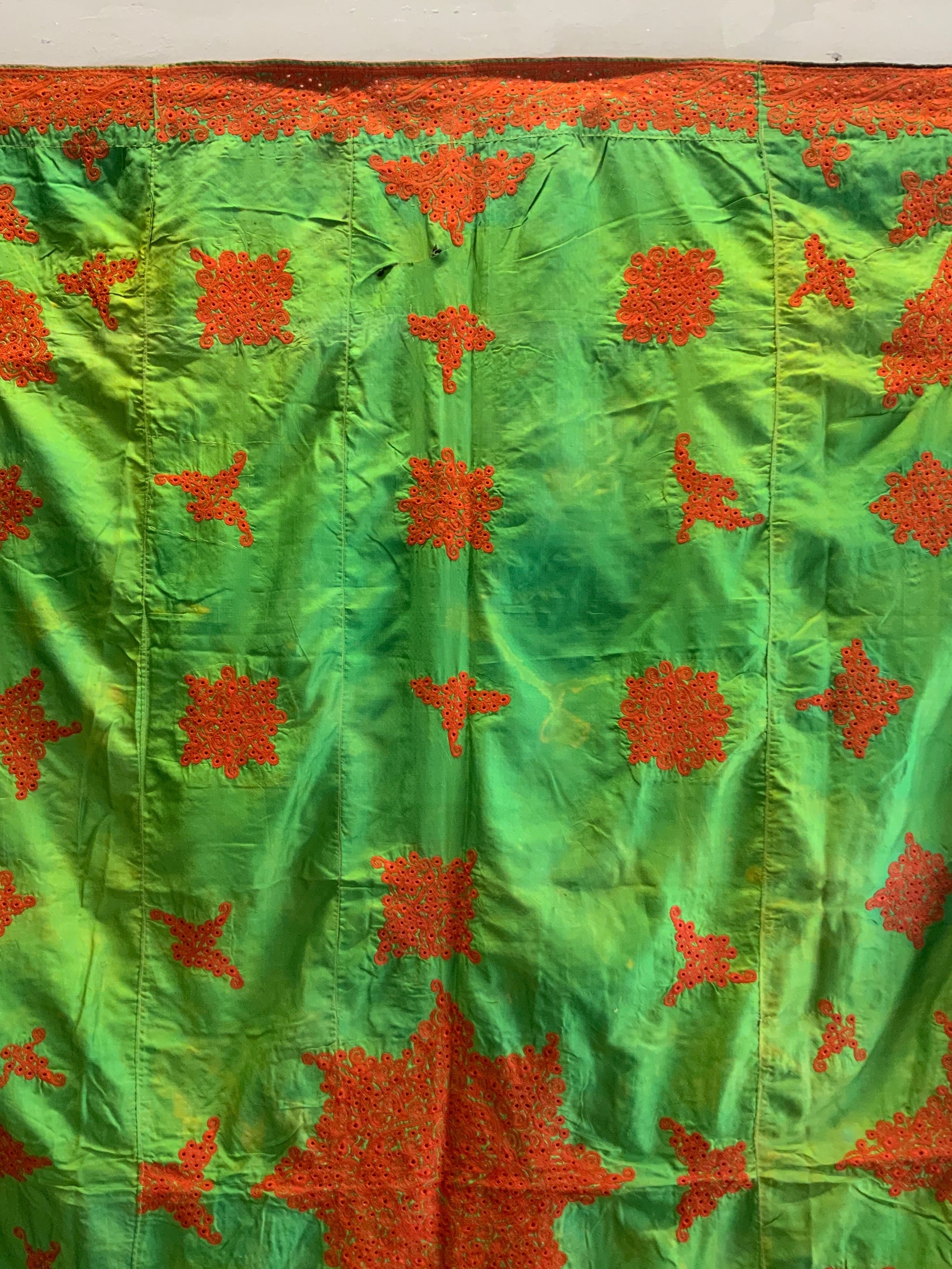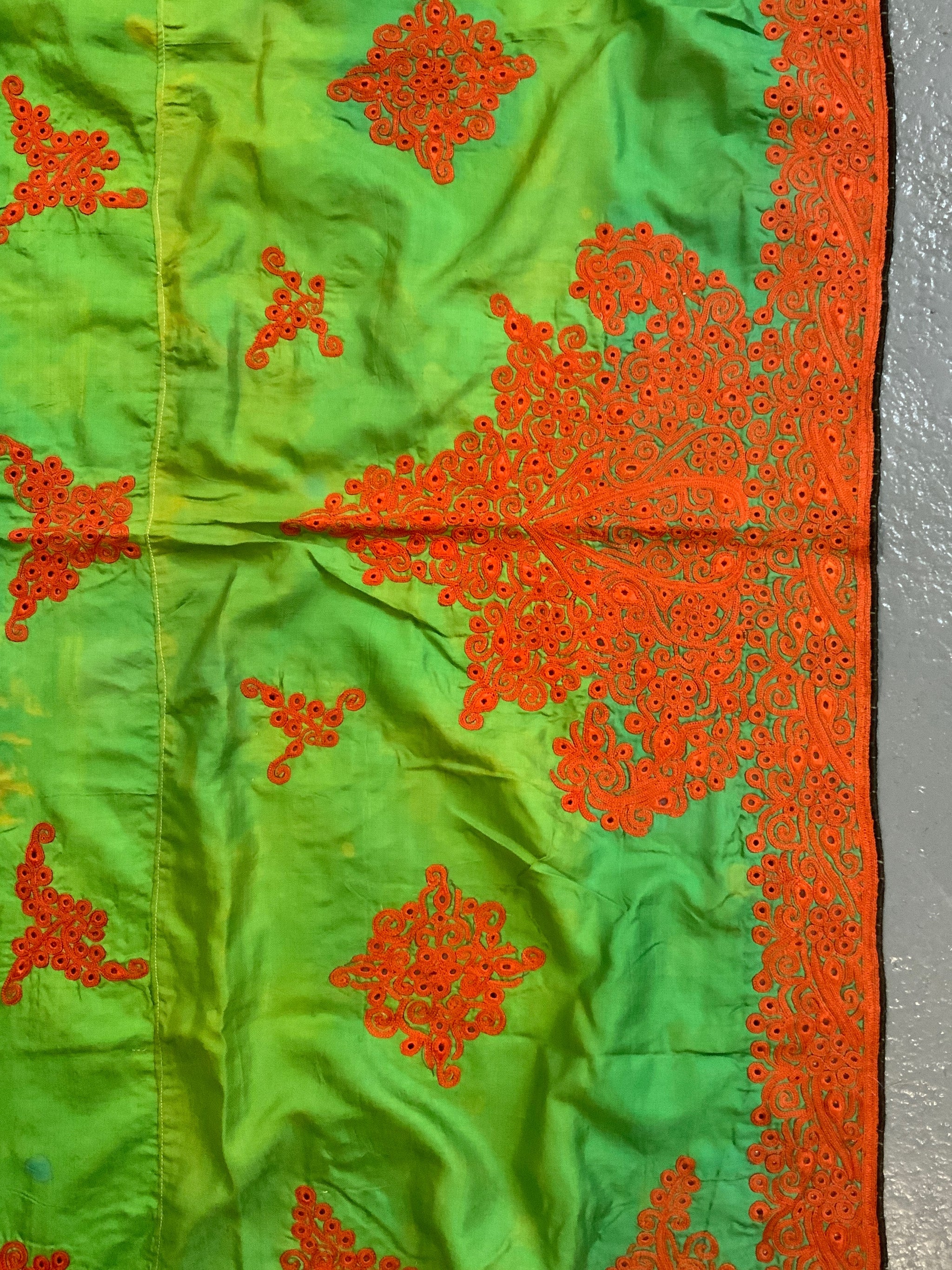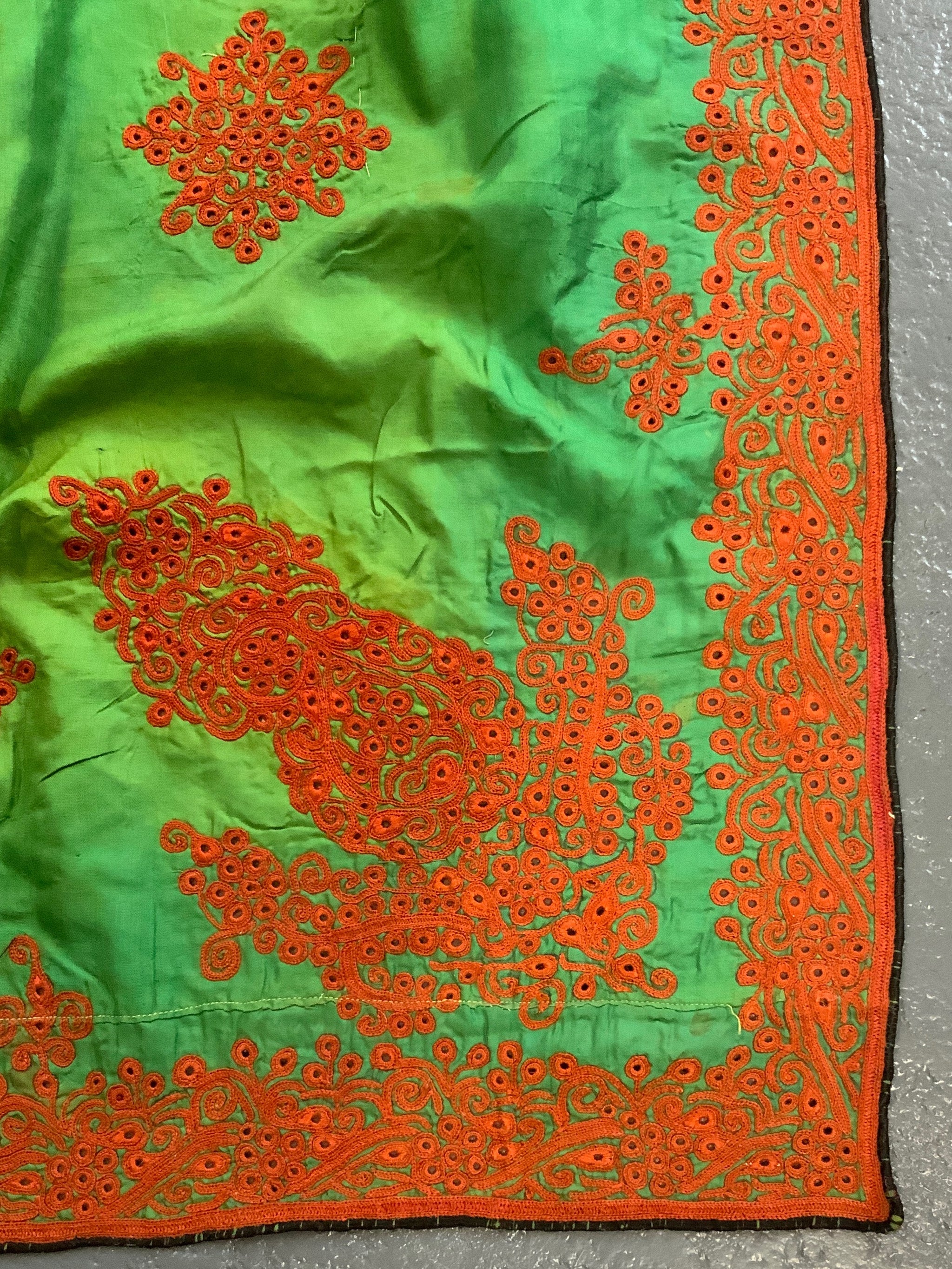 The rather unique method of achieving a heavy pattern surface on the fine lightweight green silk was to stabilise the work with a loose supplementary cotton base on the through which the work sandwiches independent blocks of pattern.