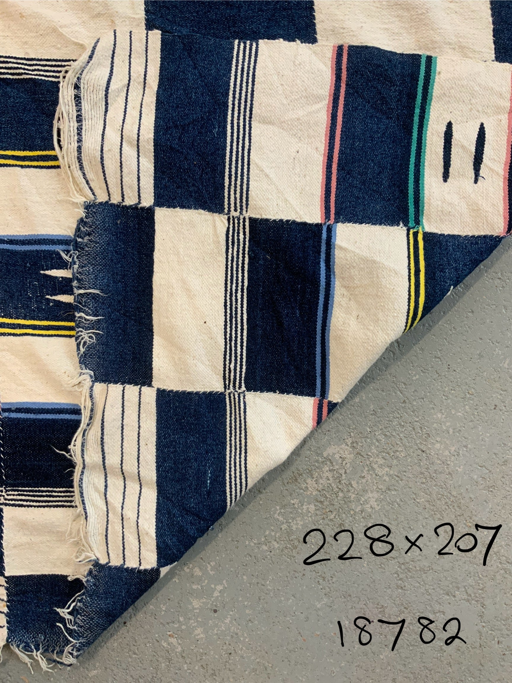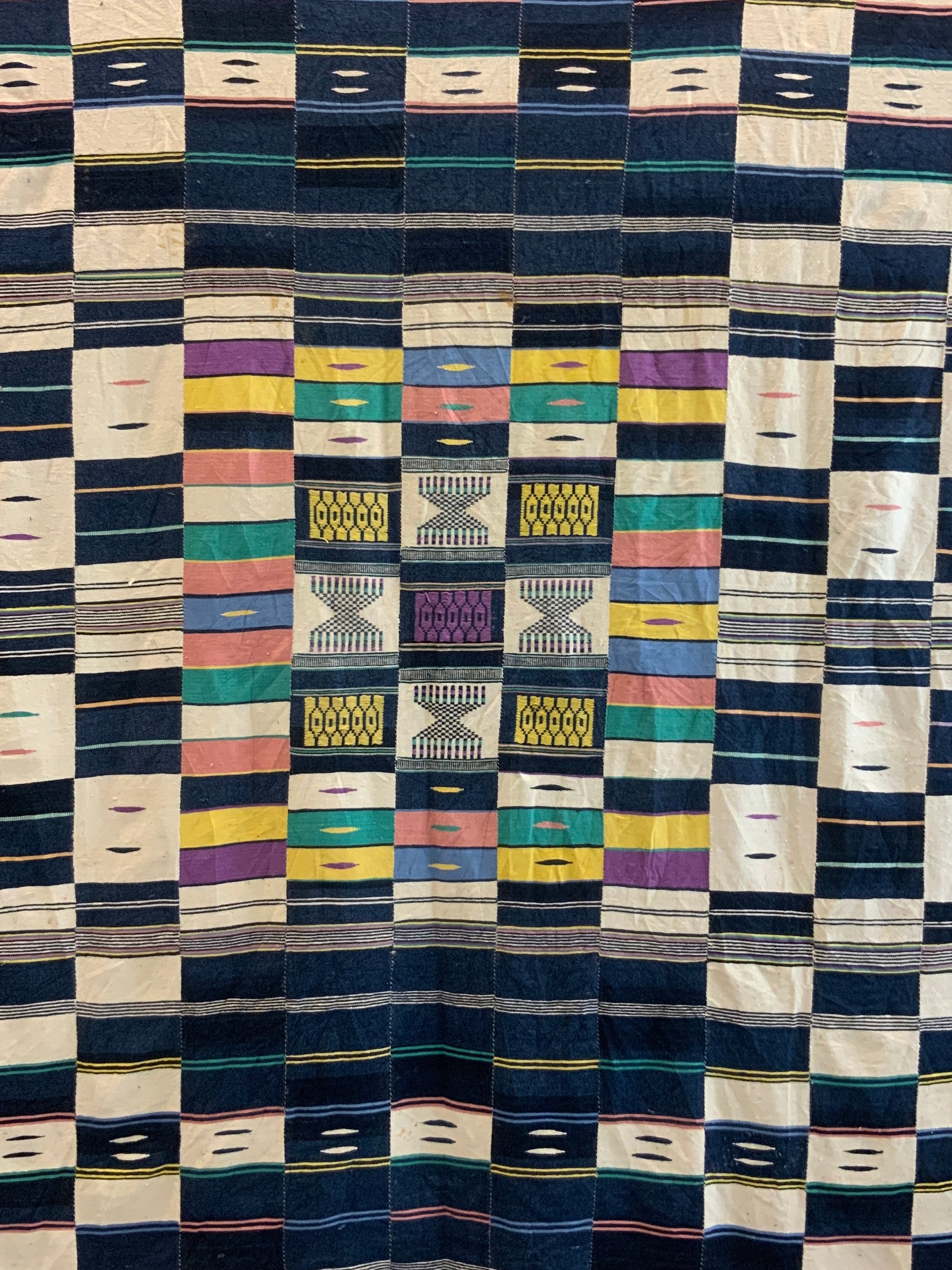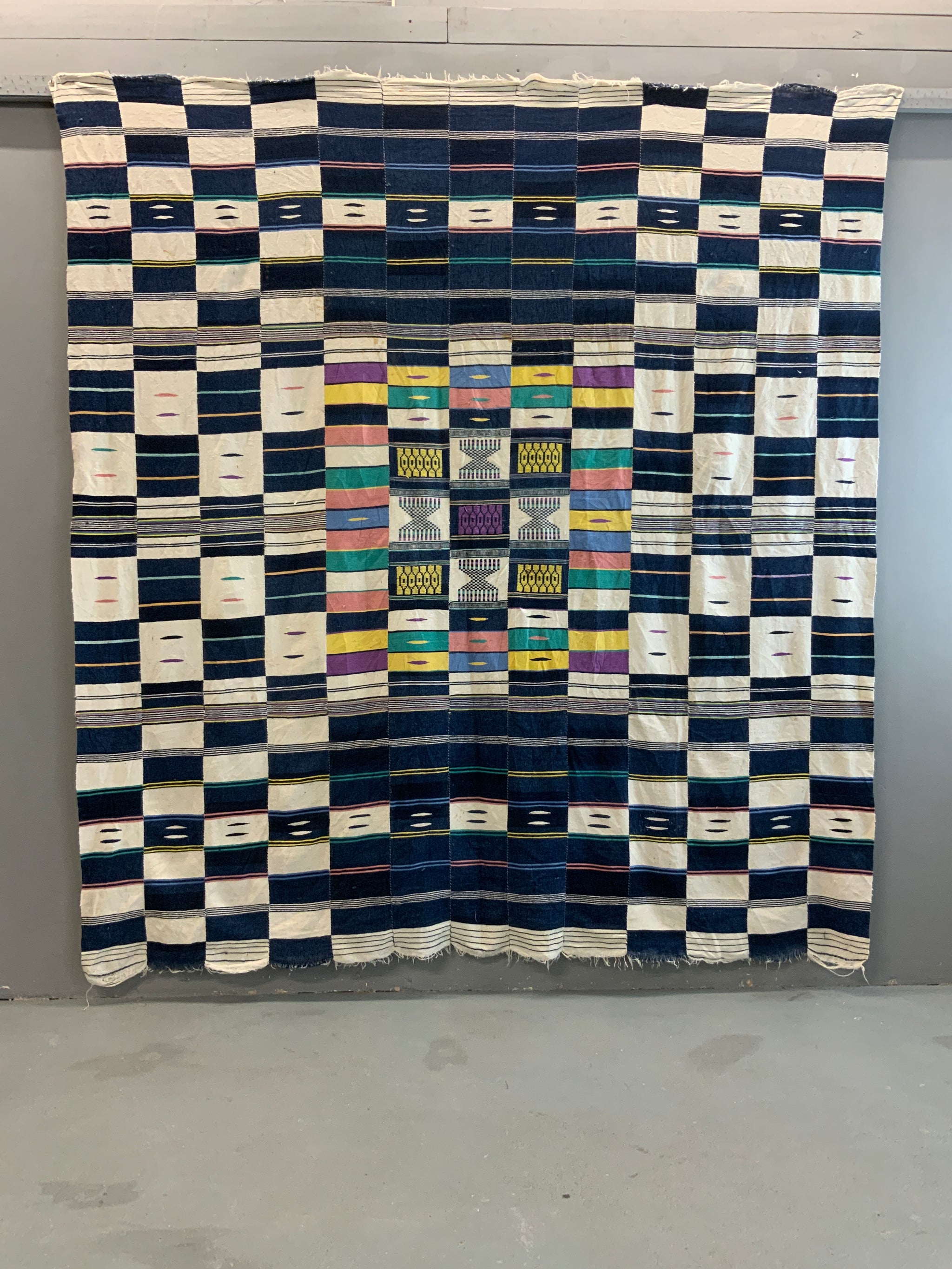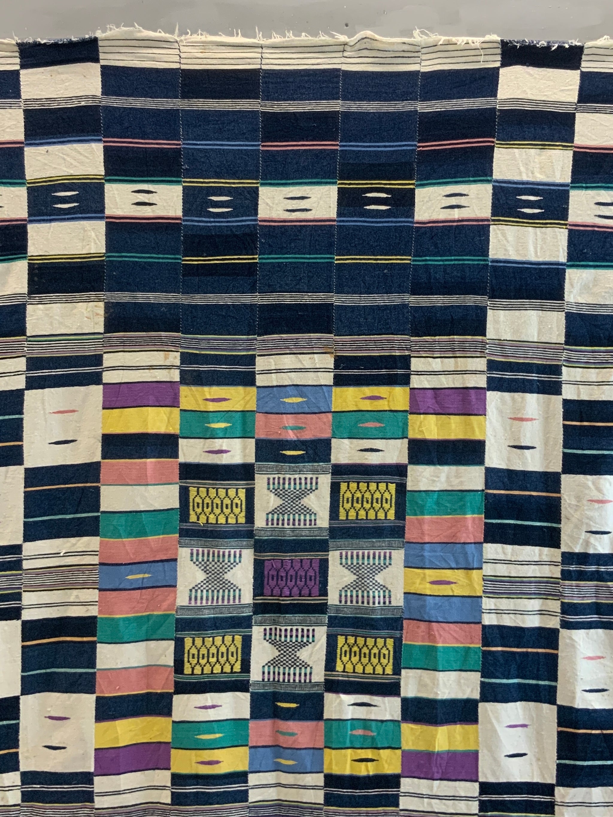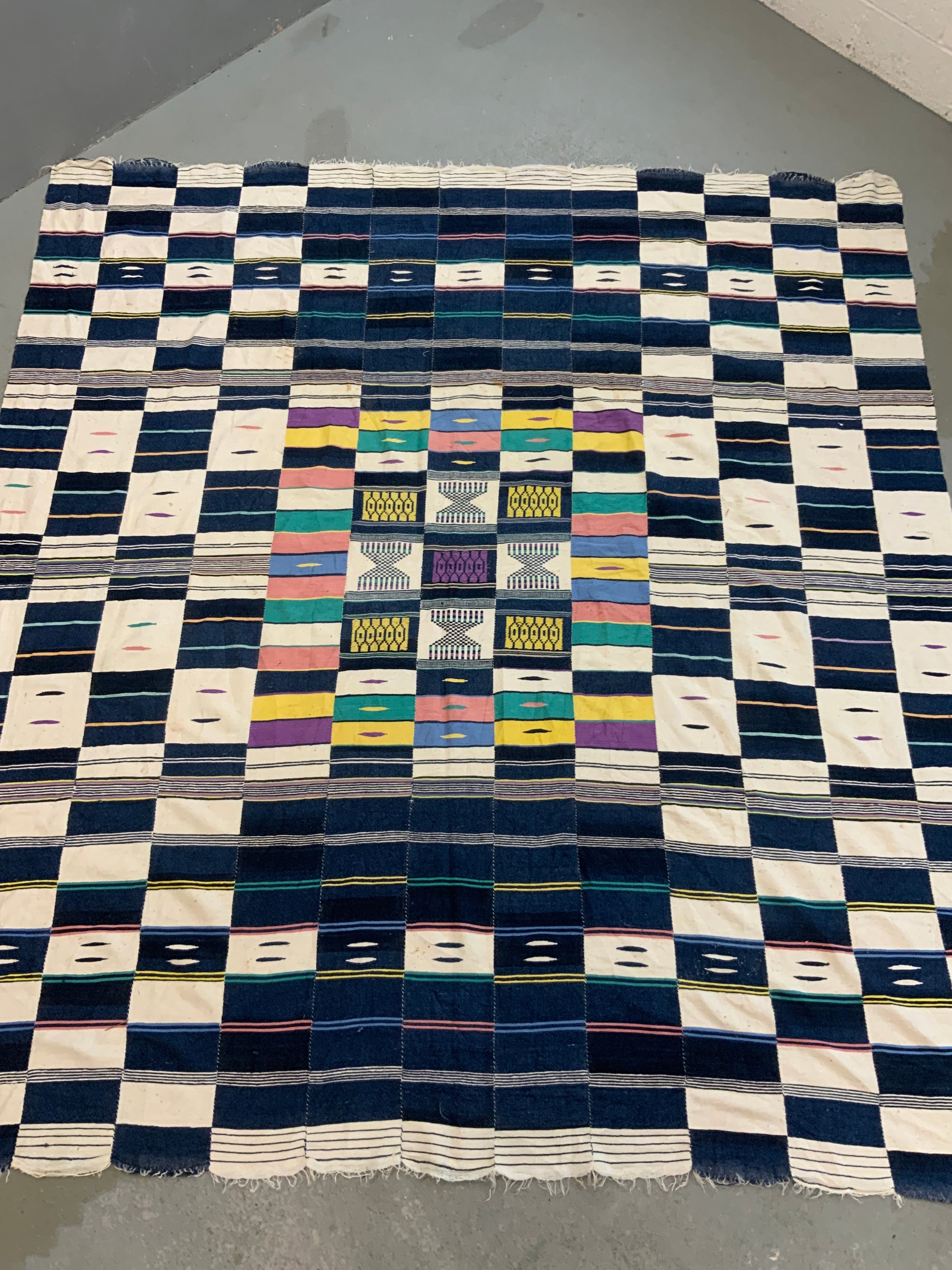 This large cotton blanket or shawl mantle comprises of long thin woven strips sewn together which is typocal of W. Africa. Some of the end parts have become loose and slightly frayed.